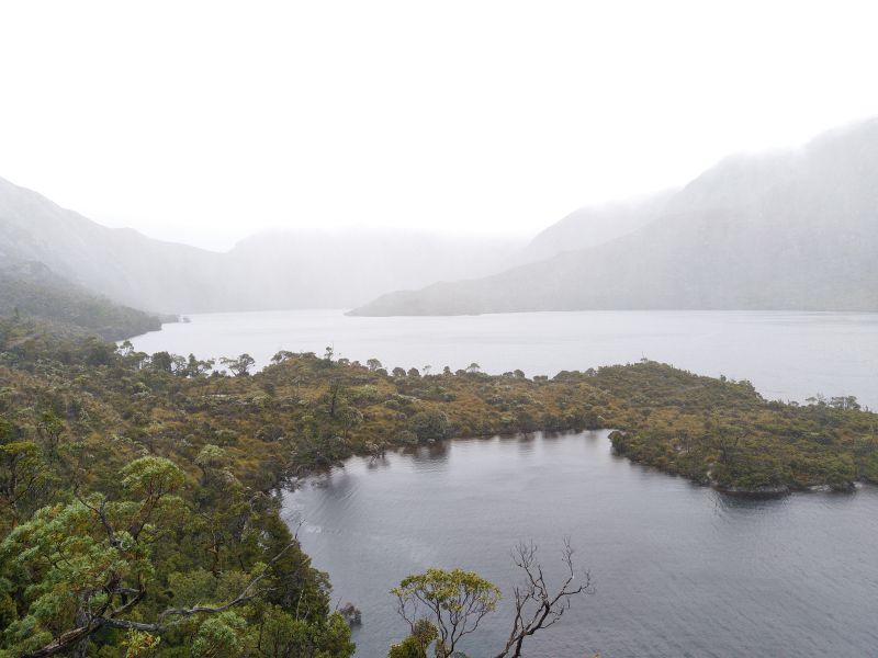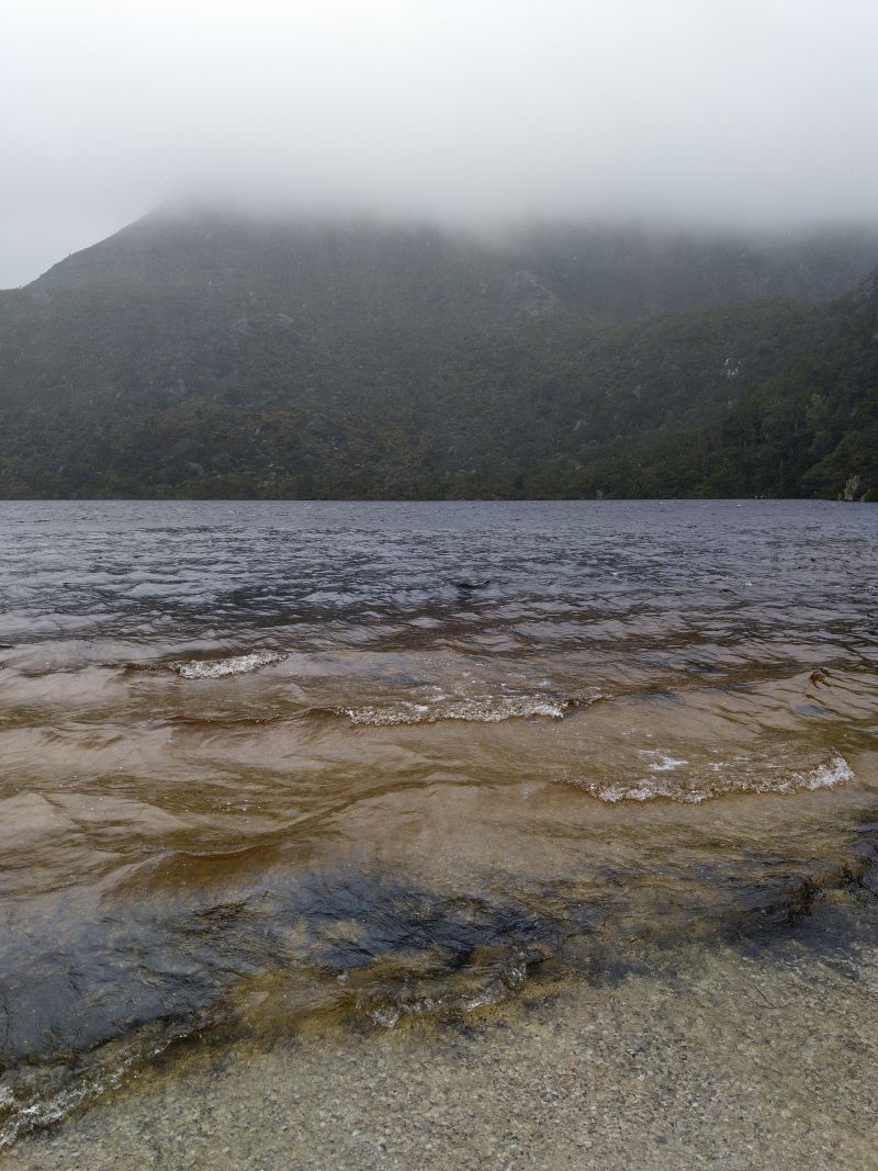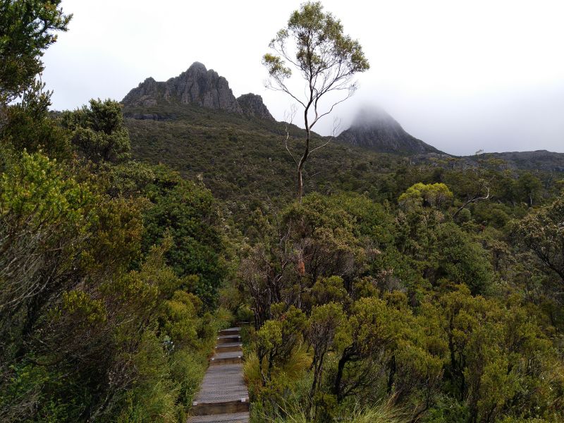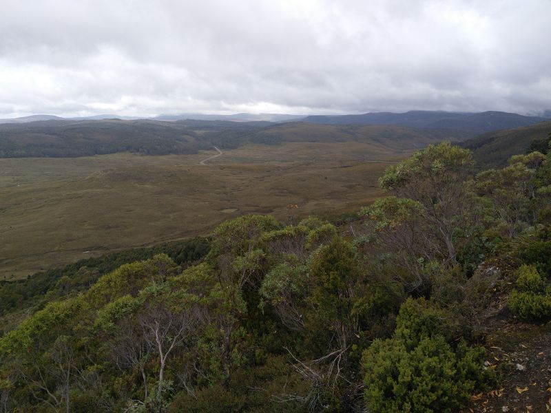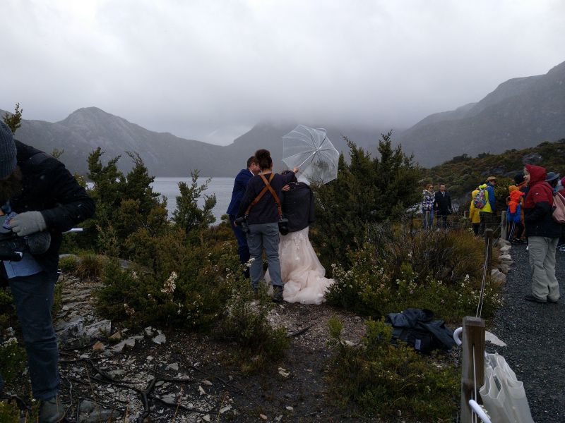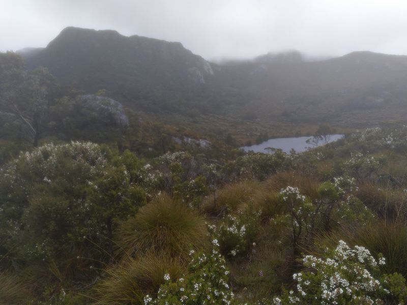 In Tullah gibt es ein Hotel direkt am See, Scones und einen dünnen Café. Die Landschaft ist immer noch grandios, es regnet nicht mehr dauernd und wenige Sekunden kommt die Sonne durch. Am Cradle Mountain Lookout halten wir und hoffen auf ein wenig Fernsicht. Es sind ganze 200m bis dorthin zu laufen. Es zieht wie Hechtsuppe - eiskalt. Der Lookout befindet sich direkt unter einem Hochspannungsmast - sehr schön ausgewählt. Wir schiessen schnell 2 Bilder und verziehen uns in den Bus. Hinter uns zieht die nächste Regenfront heran. Wir schaffen es gerade noch trocken hinein.