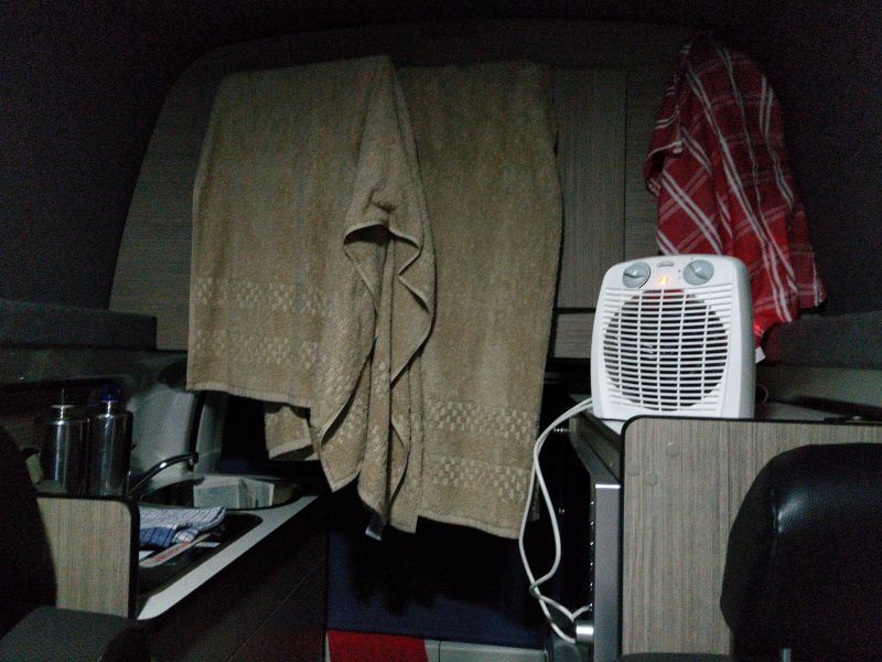 Die Wettervorhersage ist für Morgen 1-8° und Schnee. Schaun mer mal. Vielleicht werden wir heute Nacht den Heizlüfter mal ausprobieren. Natürlich nur um unsere Sachen zu trocknen........