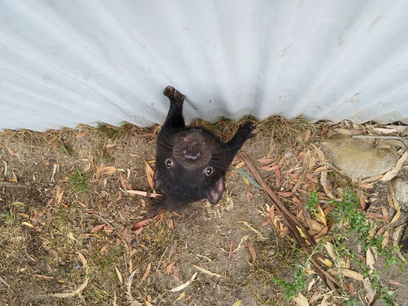 tasmanische Teufel. Im Park ist noch wenig los, aber die Fütterung der Teufel läuft schon. Ein Pfleger erzählt uns alles Mögliche und wirft den Tieren zerlegte Kängurus ins Gehege.