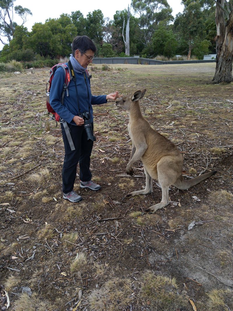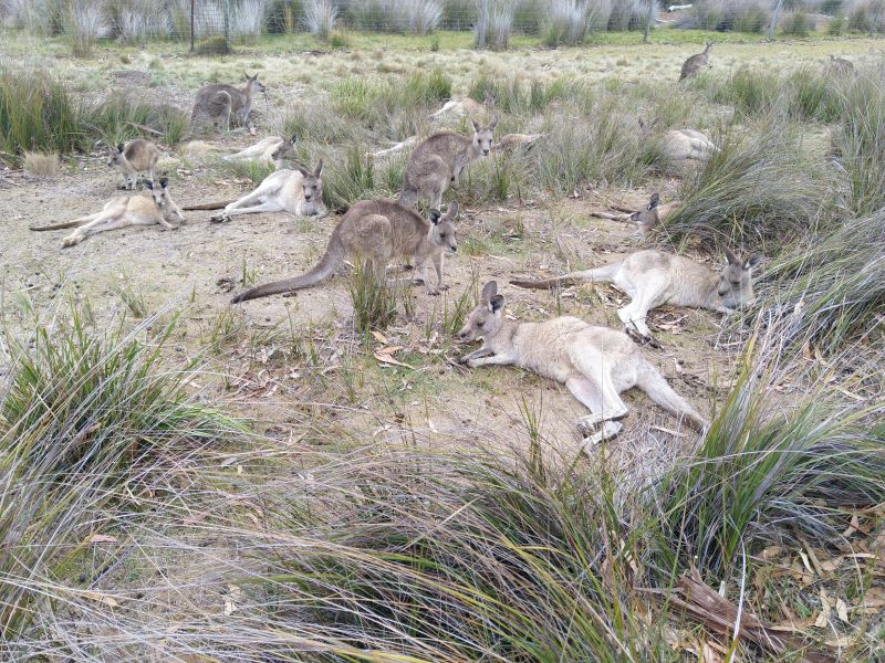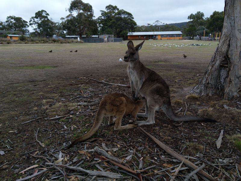Der Park hat aber auch noch andere Tiere. In einer großen Voliere gibt es die verschiedenen Kakadus hautnah. Auch 2 Adler mit verletzten Flügeln sitzen auf einem Baum. In einem weiteren Gehege sind Pademelons. Eines davon ist so aggressiv am betteln, dass es mich beim füttern durch die Fleecejacke kratzt. Alle anderen Wallabies sind eher zurückhaltend.