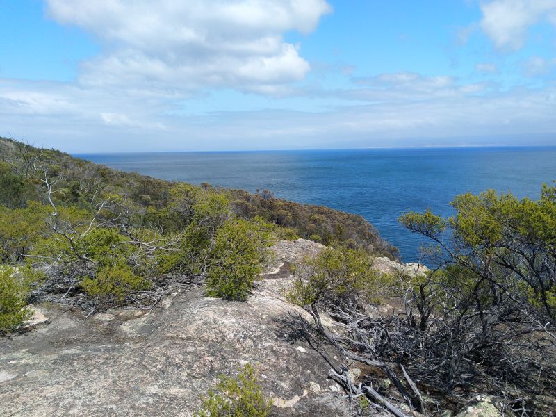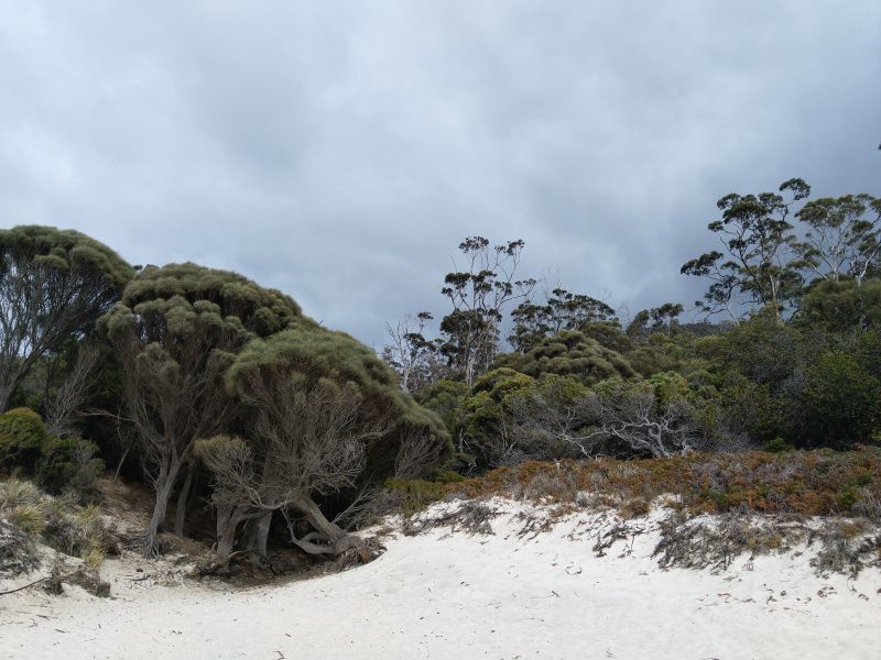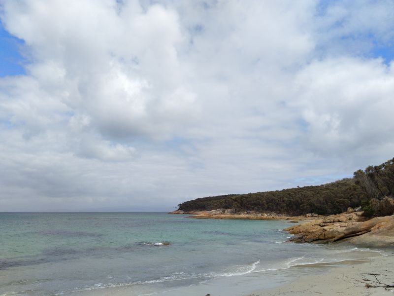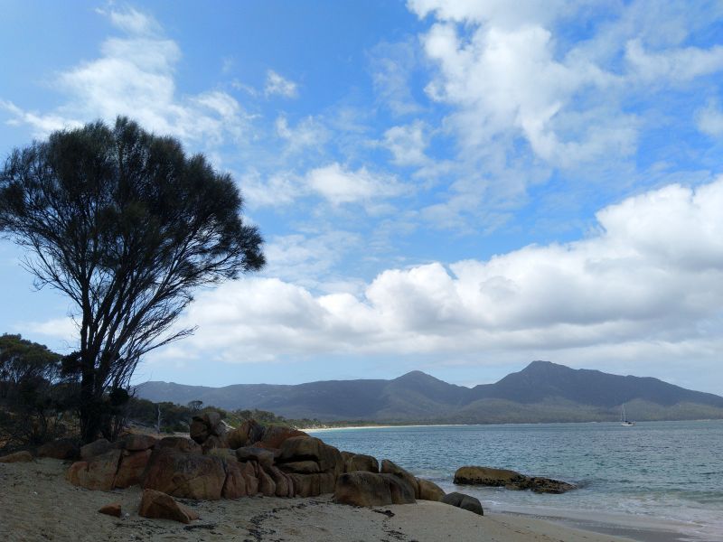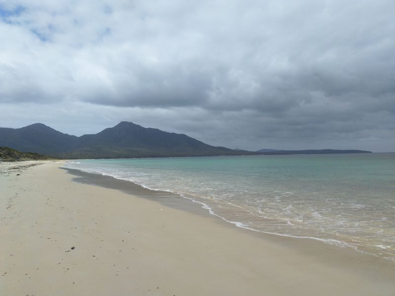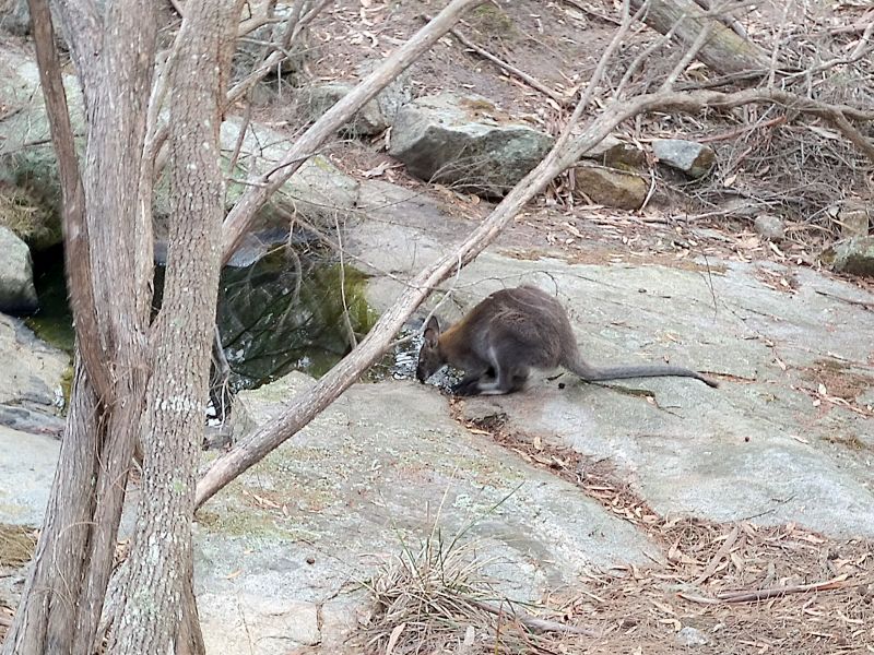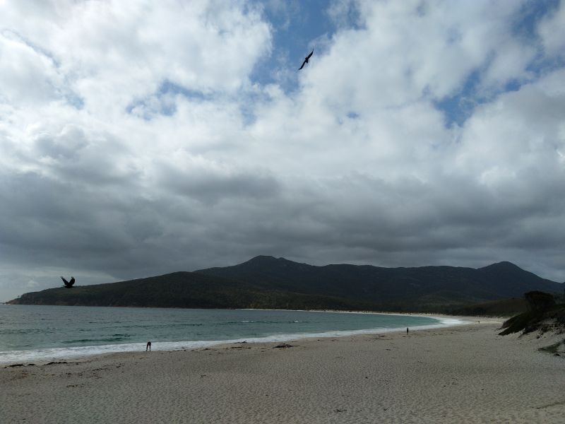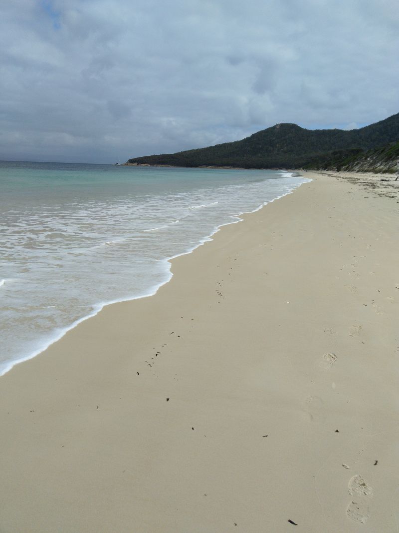 Die meisten drehen hier wieder rum, wir wollen aber den mit 11km/5h angegebenen Walk machen, der uns hinunter zum Strand der Wineglass Bay, ein Stück über das schmale Landstück bis zum Hazardbeach und dann immer an der Küste entlang zurück zum Parkplatz führt. Als wir die etwa 500 Stufen hinunter zum Strand geschafft haben kommt zaghaft die Sonne zum Vorschein. Auf dem Stück durch niedrigen, sehr trockenen, Wald sehen wir zwei Kängurus, später noch ein Drittes.
