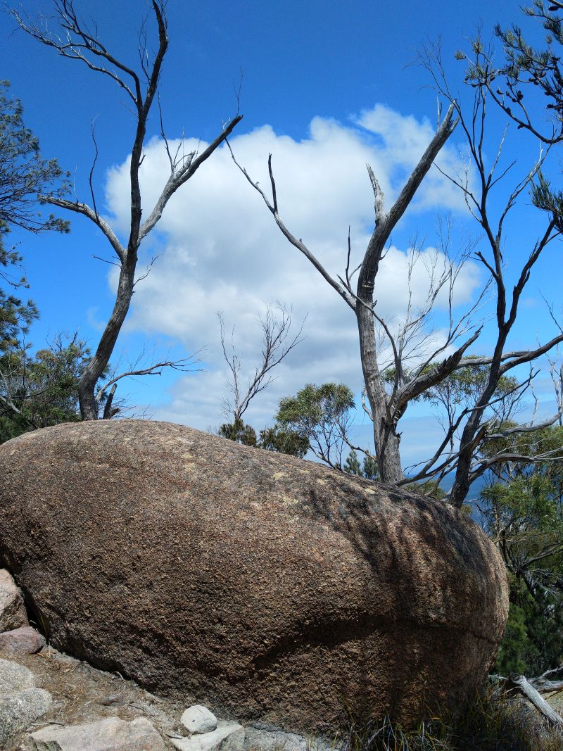 Der Weg bis zum Lookout der Wineglass Bay ist mit 40 min angegeben. Es geht relativ steil bergauf zwischen riesigen roten Felsblöcken entlang. Nur leider kein Licht, alles ist grau in grau.