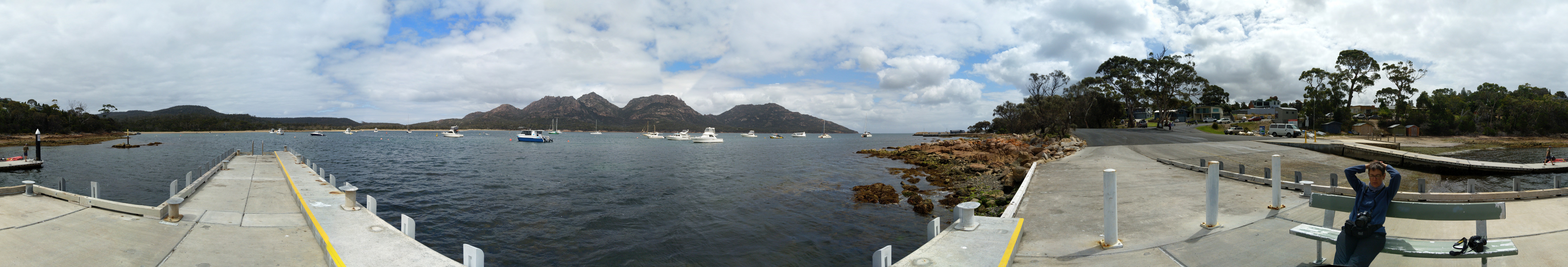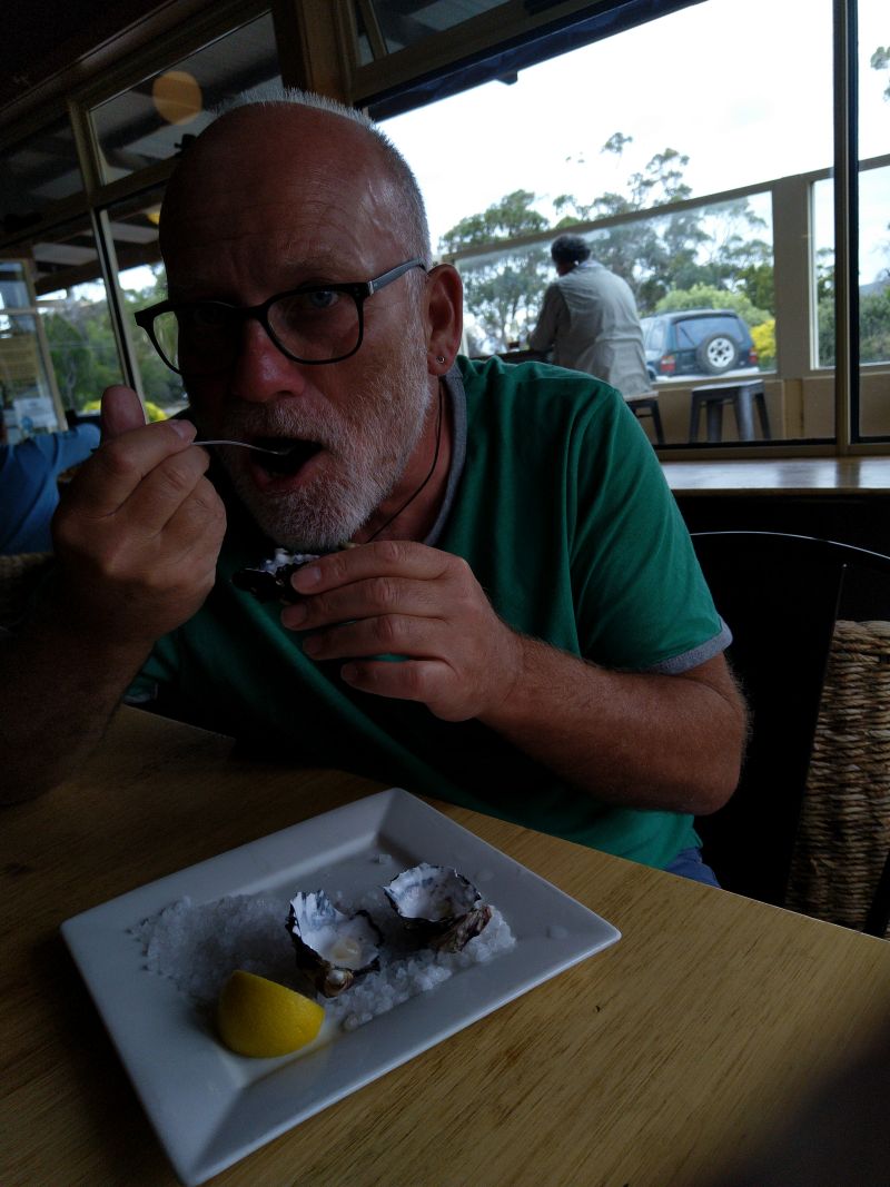 In Coles Bay trinken wir Café und eigentlich will ich noch ein Eis (es gibt nämlich eine Eisdiele). Dort ist aber eine solch lange Schlange, dass das auf morgen verschoben wird. Morgen ist unser letzter Tag in Tasmanien und den nehmen wir uns frei. Deshalb probiert Thomas auch heute Abend endlich Austern, dass hat er den morgigen Tag zum auskurieren....