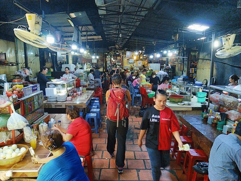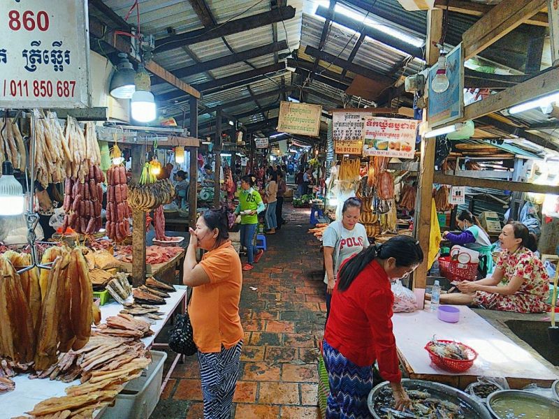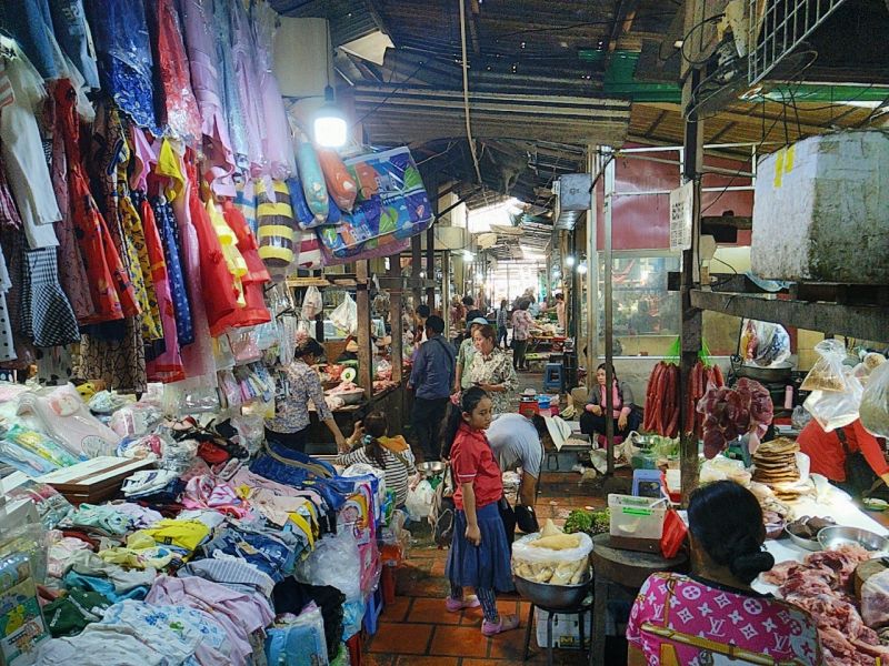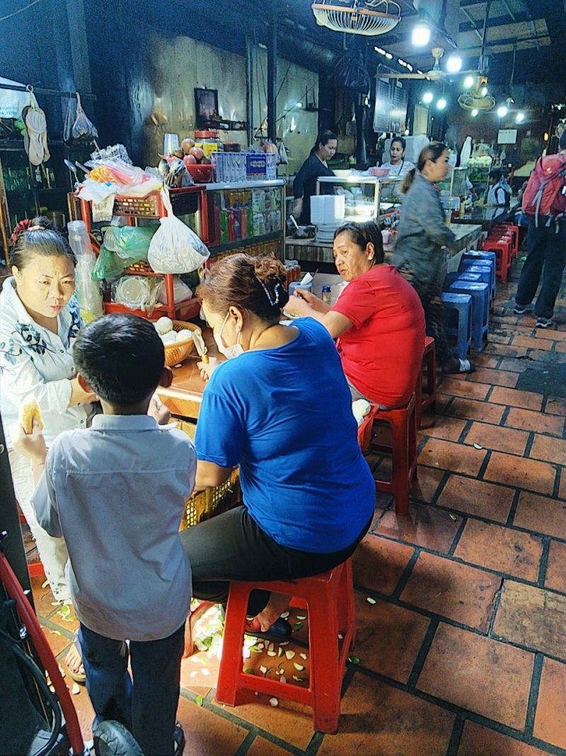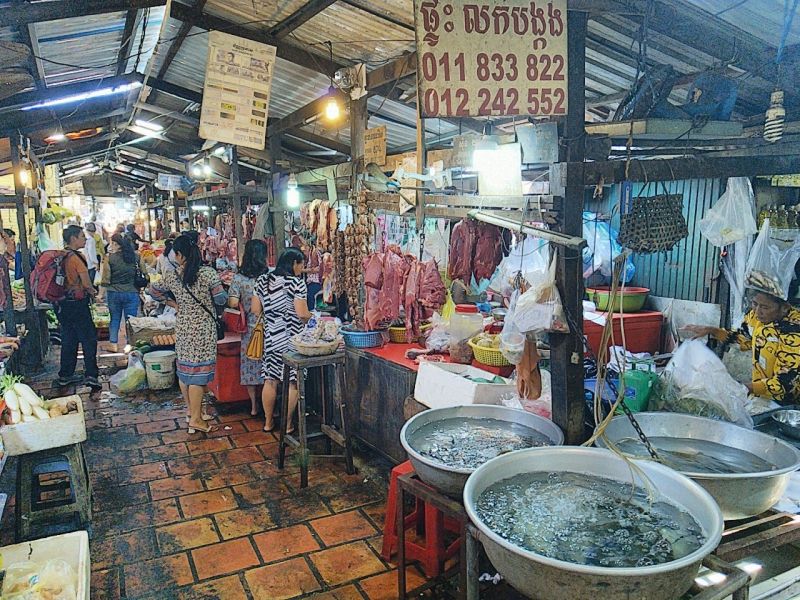 Wir gehen zum bekannten "russischen Markt", der hier ein paar Ecken weiter ist. Früher soll es hier alles gegeben haben was die Russen mitgebracht hatten, so Sina, nun gibt es dort Alles was man so im Leben braucht, einschliesslich Nahrungsmittel und Garküchen. Der Markt umfasst ein ganzes Strassenkarré und ist überdacht. Wir betreten ihn und bemerken einen stechenden Geruch nach Fleisch und ... tja, keine Ahnung was. Olfaktorisch, müde wie wir sind, eine Herausforderung. Wir schlendern umher und bewundern vor allem die Essensstände. Das Essen sieht überall gut aus, aber die hygienischen Zustände sind etwas zweifelhaft. Nach einer halben Stunde müssen wir an die "frische" Luft und setzen uns in ein Café - klimatisiert. Mittlerweile dürften es um die 30° sein. Ich probiere einen Espresso, die Franzosen waren ja lange Zeit hier, und siehe da - SUPER. Dazu gönnen wir uns noch einen frischen O- und Ananassaft.