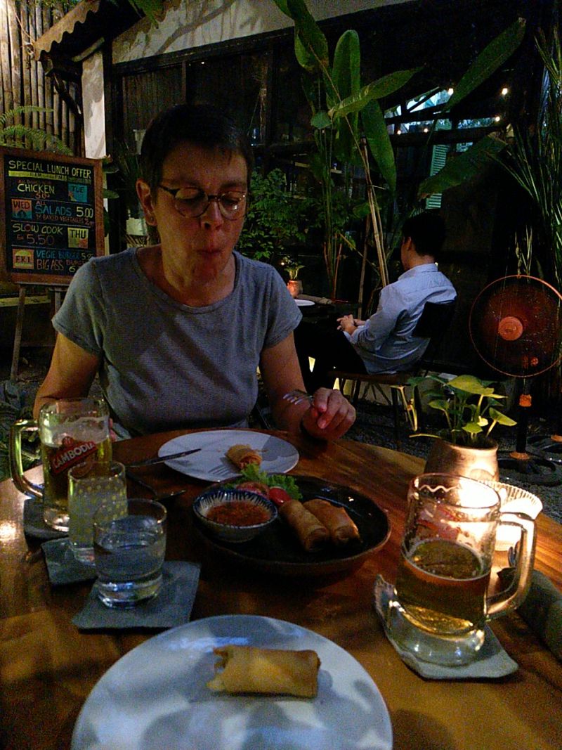 Wir bringen unsere Kameras ins Hotel und gehen dann zum Essen. Heute Mittag haben wir das "Sesame" geehen, eine Suppenküche. Das hat uns gefallen, aber wir finden es nicht mehr. Fast gegenüber unseres Hotels gibt ein Restaurant unter Bäumen. Da gehen wir letztendlich hin. Es gibt leckere Frühlingsrollen mit toller selbstgemachter Soße und danach ein Fleischgericht mit Pfeffer von Kampott. Elke nimmt den Salat von Gebratenem Gemüse. Dazu Bier aus Kambodscha - das zischt direkt.