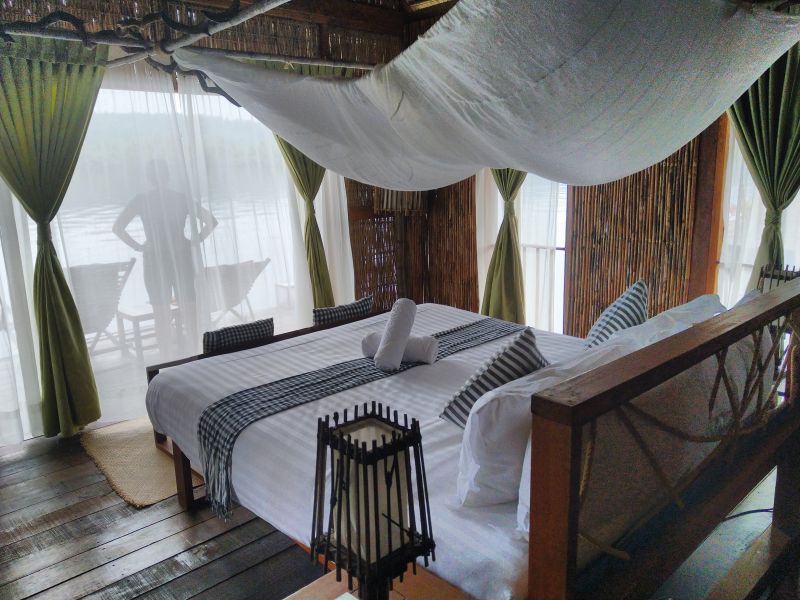 Das Eco Resort hat 12 Zimmer bzw. Hüttchen, die alle auf das Wasser gebaut sind. Sie sind nicht besonders gross, haben keine Minibar, Klimaanlage oder wifi 😬, aber ein Bett mit Moskitonetz und eine kleine Terrasse die natürlich ebenfals auf dem Wasser ist. Man versichert uns, dass es ungefährlich sei im Fluss zu schwimmen. Krokodile gäbe es keine. Nach einem Rundgang, das ist in weniger als 2 Minuten erledigt, springe ich ins Wasser. Endlich mal kühl und man kann wirklich schwimmen. Leider ist es den ganzen Tag schon bedeckt. Wird also wieder nix mit dem Sonnenuntergang.