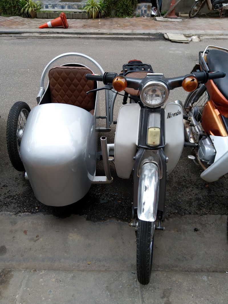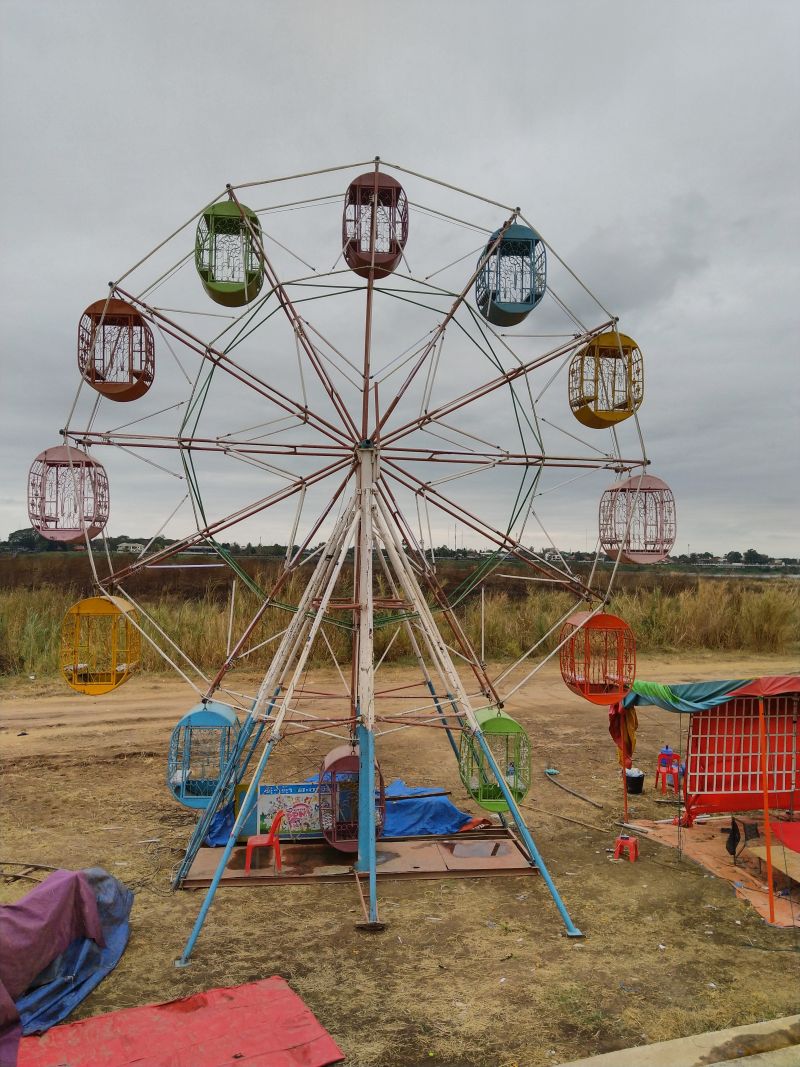 Nachdem alles verstaut ist laufen wir mit leichtem Gepäck wieder los. Zuerst an den Mekong, der allerdings mit wenig Wasser in der Ferne in einer Rinne vor sich hindümpelt. Etwas enttäuschend. An der Uferpromenade ist der Nachtmarkt noch menschenleer, aber die 2 Riesenräder sind interessant. Einfache Käfige an dünnen Stangen die von einem kleinen Elektromotor über einen umlaufenden Riemen angetrieben werden. Toll.