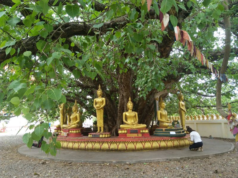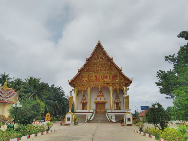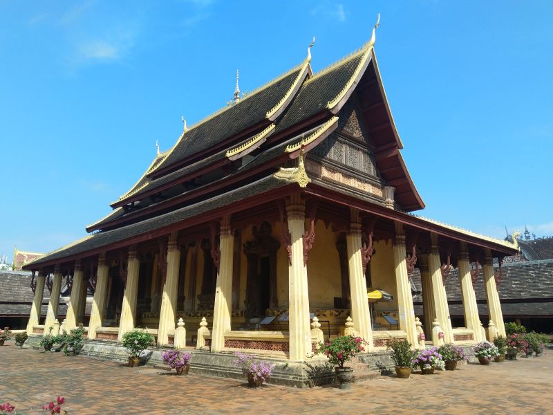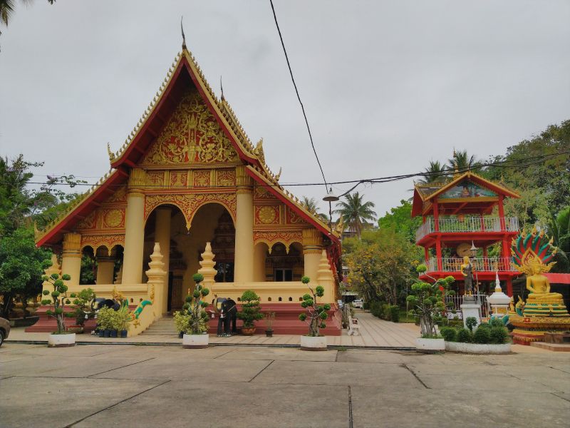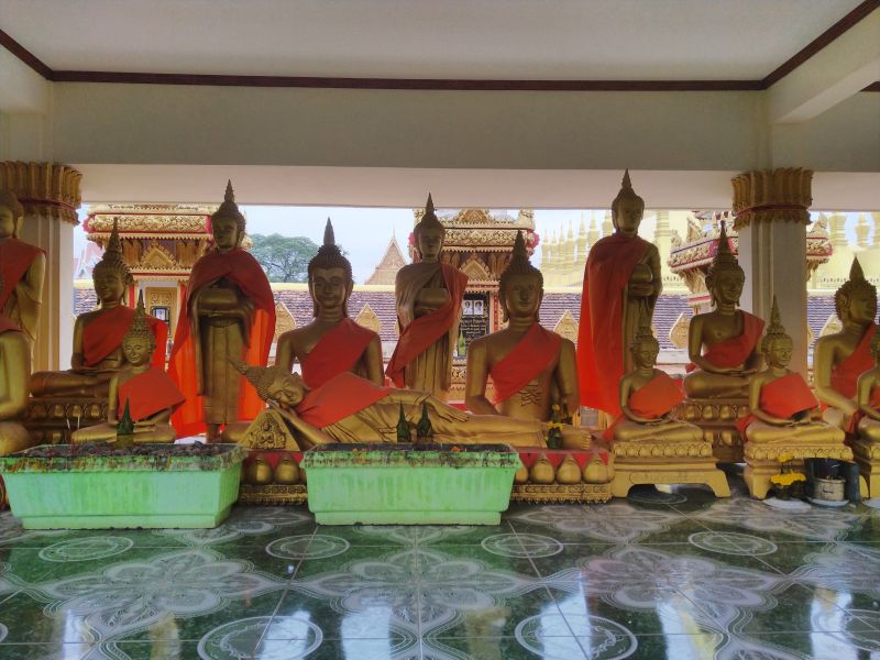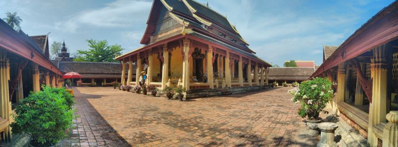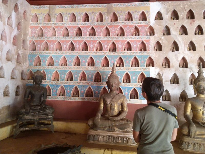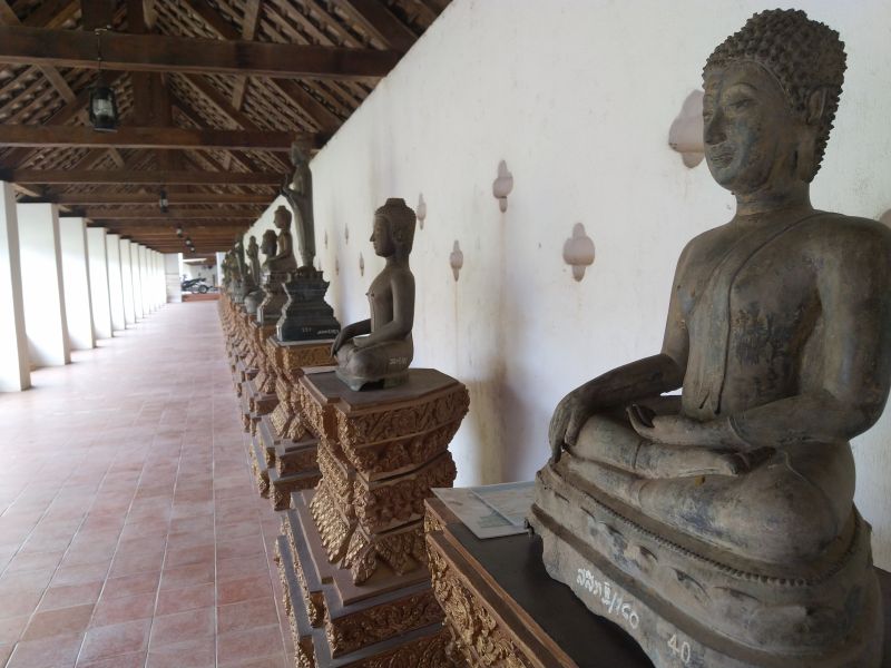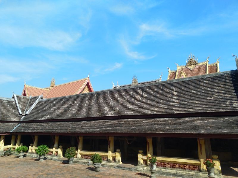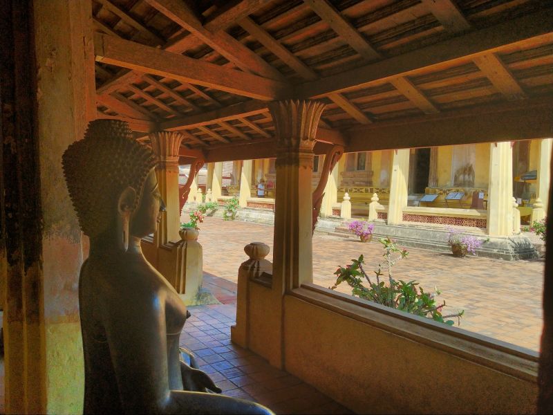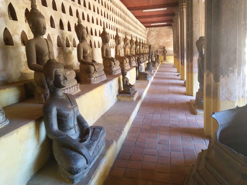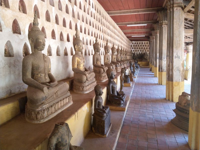 Wat Si Saket haben wir uns ja extra aufgehoben um es bei schönem Licht zu fotografieren. Jetzt hat es tatsächlich einen blauen Himmel. Wieder 10000 Kip weiter gehen wir zu einem Tempel mit einem Kreuzgang und der hat es in sich. Tausende von Buddha-Statuen sind dort untergebracht. Es ist das bisher schönste Wat in Laos - echt klasse. Im Tempel selbst darf man wieder nicht fotografieren, aber das machen wir mit Fotos von Hof, Kreuzgang und Statuen wett.