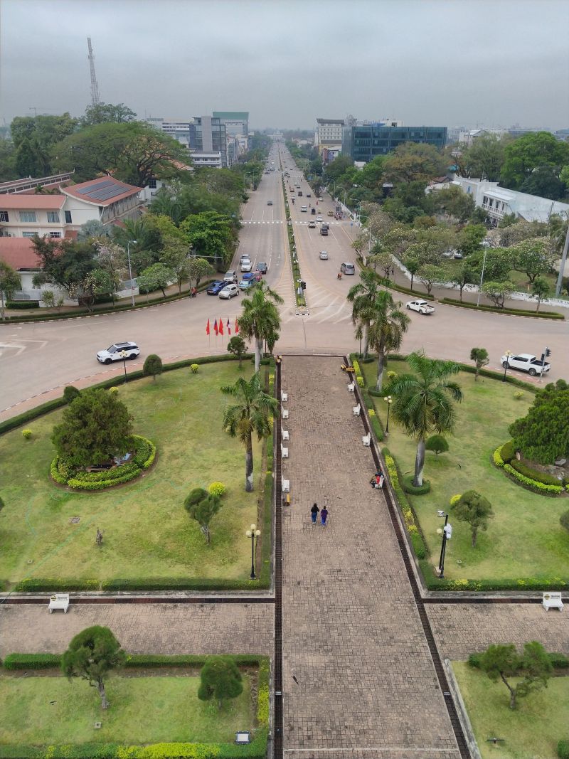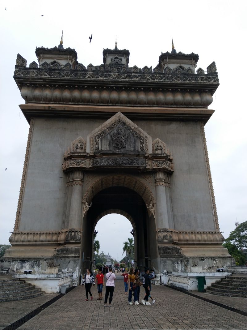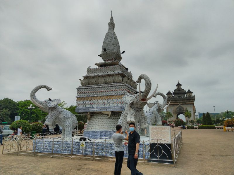 Tor des Sieges. Es ist ein wenig wie der Triumphbogen in Paris, aber nie fertiggestellt worden. Laut Wikipedia soll Zement, der für einen Flughafen für den Vietnamkrieg gedacht war, dafür "abgezweigt" worden sein. So richtig schön ist der Turm nicht und die Aussicht von oben ist auch nicht der Brüller. Um den Platz aufzuhübschen haben die Chinesen eine Stupa spendiert - zusammengesezt aus tausenden von typischen Porzellanschälchen, -tässchen und -löffeln. Man muss es nicht schön finden, aber ungewöhnlich ist das schon.