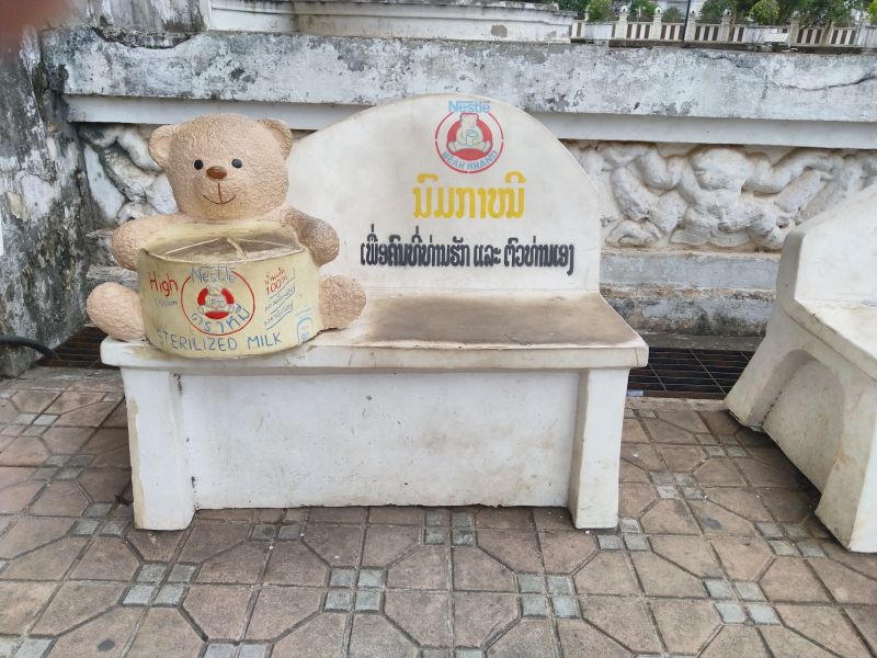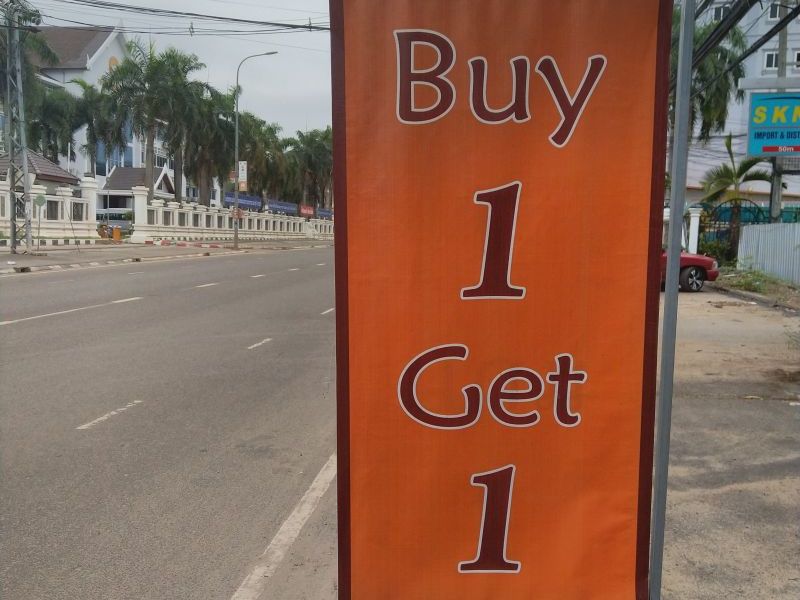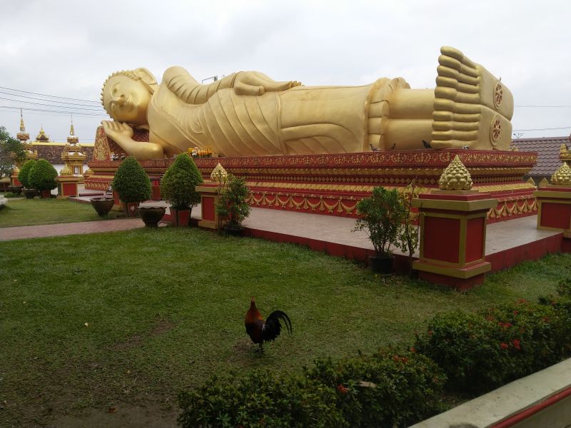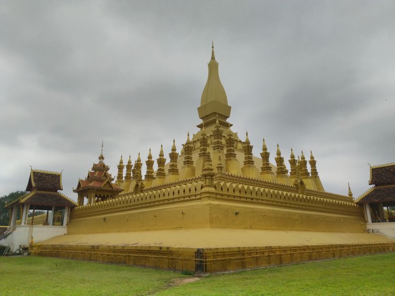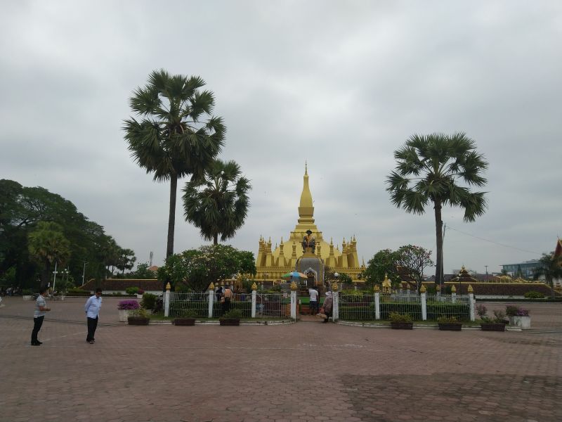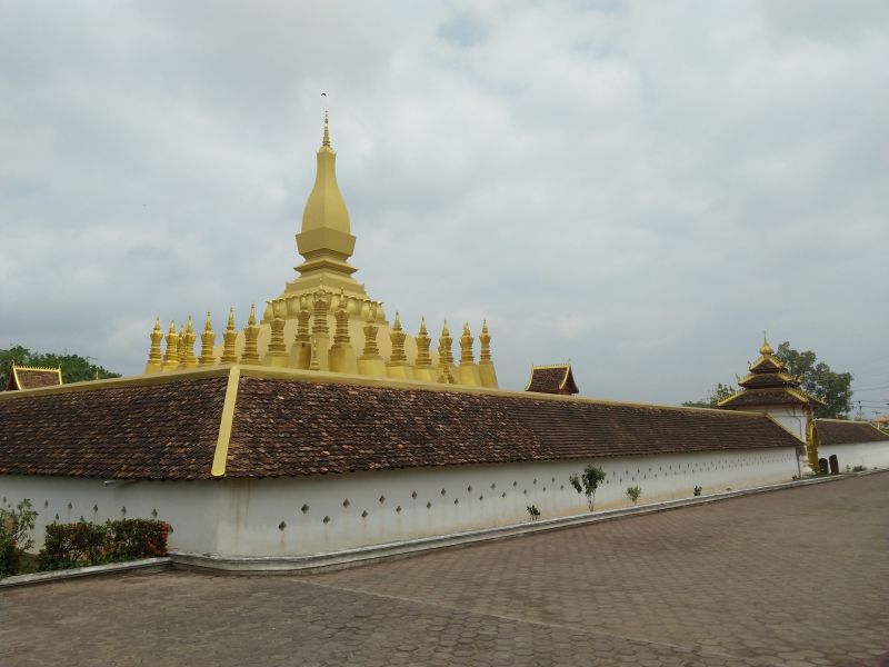 Pha That Luang, dem Nationalsymbol. Der Weg dahin entlang der Sraße 23 ist heiss und mühsam. Zur Aufmunterung gibt es an einem Café die nette Werbung "Buy One Get One". Es ist zwar immer noch bewölkt, aber locker um die 30° und feucht. Für 10000 Kip Eintritt darf man auch rein. Zum ersten Mal sehen wir einen Kreuzgang um die riesige Stupa herum. Sehr ungewöhnlich. Wir umrunden sie insgesamt 3 mal. Im Kreuzgang, im Innenhof und einmal ganz aussen drumherum. Schon sehr imposant.