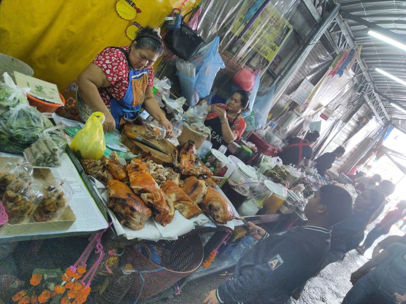 Das Wetter ist heute Morgen schon wieder trübe - wenigstens regnet es nicht. Bisher war es immer nachmittags besser. Also laufen wir heute zuerst, unweit des Hotels, zum Wat Chan. Wir sind schon zweimal dran vorbei gelaufen auf der Suche nach einem Restaurant und es ist uns durch schöne Elefanten am Eingang aufgefallen. Die Maus freut sich immer auf Elefanten. In den Tempel kommen wir zu so früher Stunde nicht. Er ist wahrscheinlich noch zu, weil die Mönche auf ihrem Almosengang unterwegs sind.