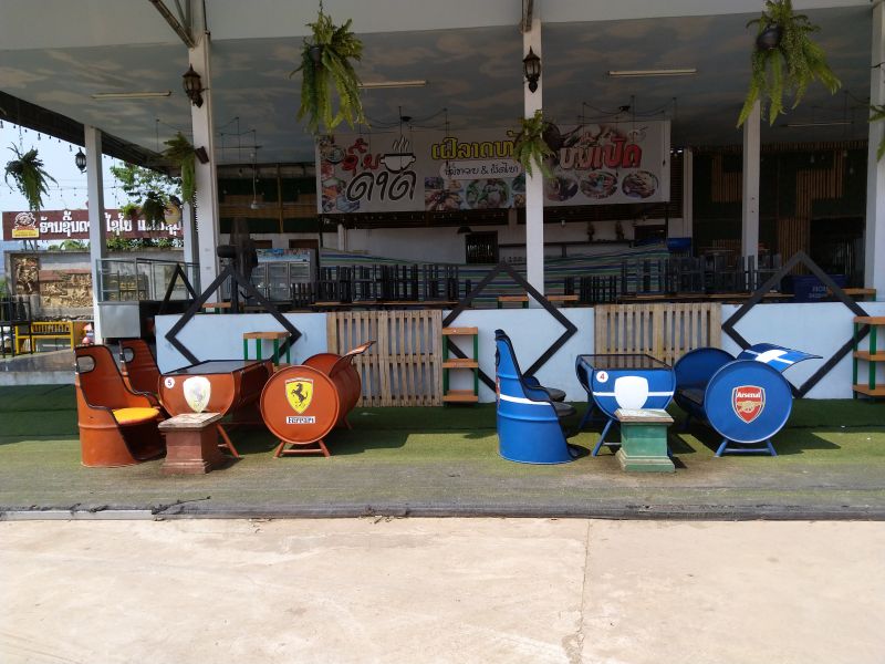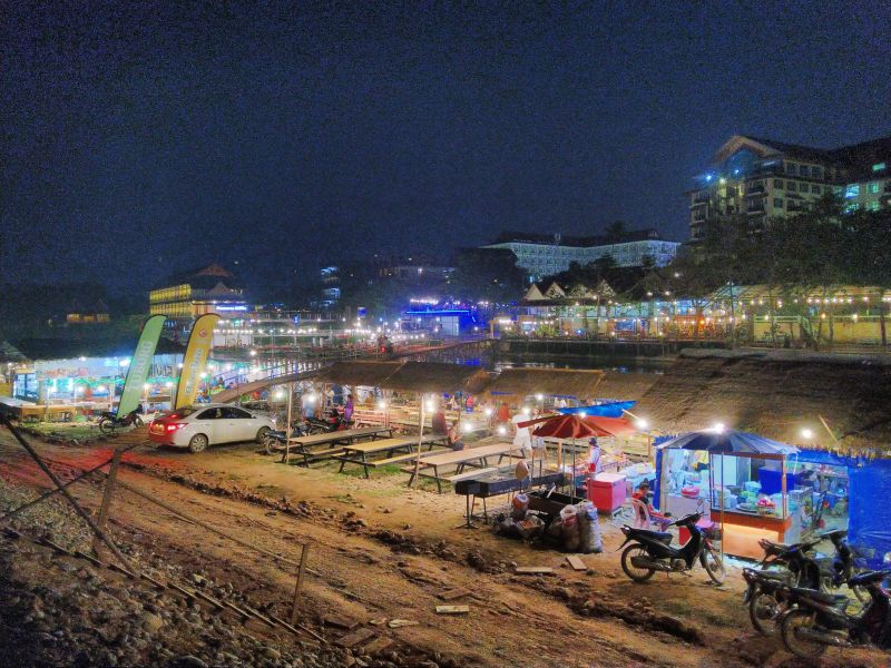 Auf einer staubigen Straße kommen wir ans Ufer. Oha. Man kann hier am Ufer und auch im Wasser sitzend speisen. Alle paar Meter wechselt die laute Musik. Auf dem Wasser paddeln Touris oder lassen sich knatternd kutschieren. Auf der schmalen, kostenlosen Holzbrücke muss man ganz schön acht geben. Die Mopeds nutzen sie auch.