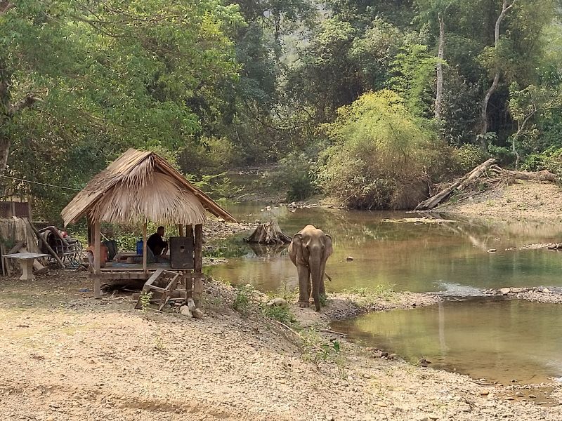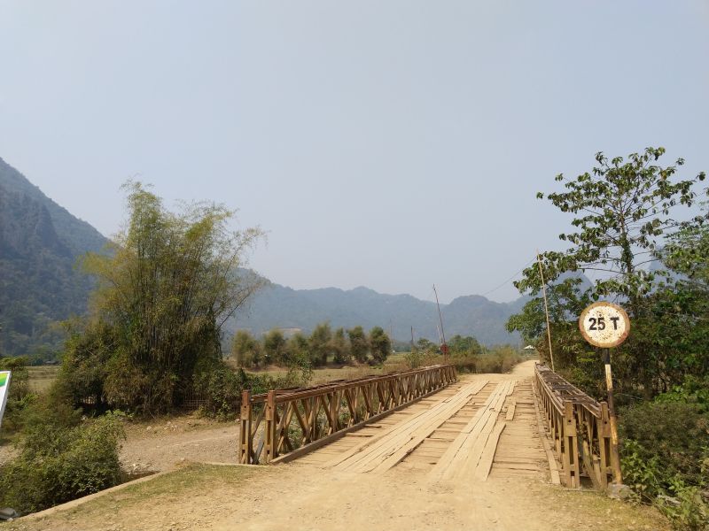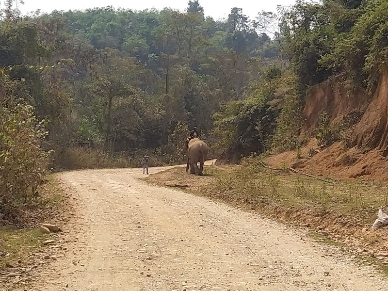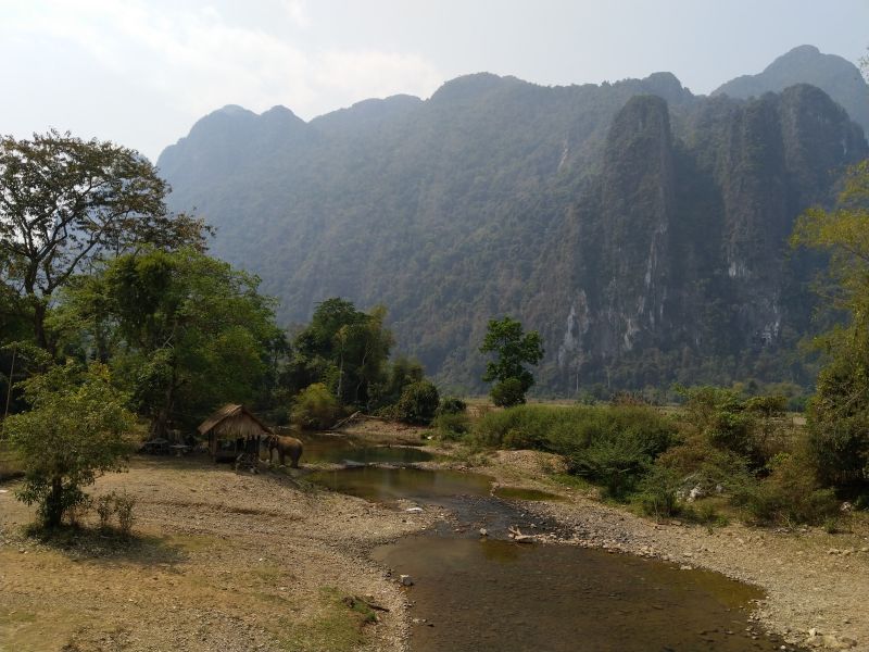 Die Strecke ist aber sehr schön, wir sind umgeben von den wunderschönen Karstbergen, fahren durch kleine Dörfer und über abenteuerliche Brücken. Viele Kühe und Kälbchen kreuzen unseren Weg, hie und da auch mal ein Wasserbüffel. Irgendwann kommen wir um eine Kurve und sehen vor uns: einen Elefanten! Damit hätten wir nun wirklich nicht gerechnet. Er wird an den Fluß geführt und das schauen wir uns dann natürlich auch noch an.