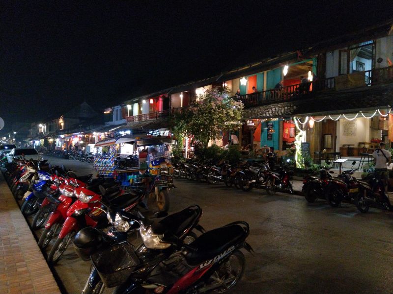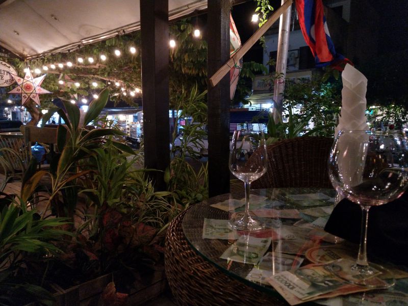 Um 5 wird der Nachtmarkt aufgebaut und wir laufen los. Corona hin oder her - ich hab Hunger. Direkt neben dem Hotel geht die Fressmeile los. Im ersten Laosurlaub kostete alles 10000. Heute fehlen diese Schilder und es verirren sich nur wenig Touris hierher. Die Youngsters sind zwar total cool, aber beim essen eher sehr konservativ. Auch wir ziehen heute ein Restaurant an der Hauptstrasse vor. Laap und einen gegrillten Fisch gibt es.
