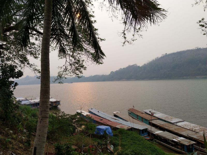 Gegen 4 hören wir Trommeln. Ist vielleicht im nahen Wat etwas besonderes? Wir ziehen uns an und kommen bis zur Rezeption. Wir bekommen die Nacht die wir nicht hier sind erstattet. Nun haben wir wieder genügend Kip, aber die Trommeln haben aufgehört. Wir schlendern über den angrenzenden Markt zum Mekong runter. Die Sonne ist Blutrot. Es sind offensichtlich so viele Partikel in der Luft, daß so früh die Sonne schon rot ist. Dazu gibt es eine sehr schöne Erklärung von "der Sendung mit der Maus".