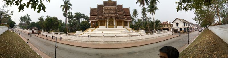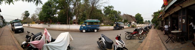 Wir stehen um 6 Uhr auf, weil da der Almosengang der Mönche sein soll. Bei unserem ersten Mal hier war das schon sehr beeinruckend. Aber schon nach wenigen Metern sehen wir, dass wir zu spät sind. Einige kommen uns mit Kameras entgegen. Mist - wäre also noch früher. Wo wir schon auf sind bezahlen wir für den Aufstieg, 328 Stufen, auf den Phousi 20000/Person. Der Phousi ist eine Erhebung mitten in der Stadt mit einem Wat oben drauf. Wenn nicht gerade der Dunst so dick ist wie heute könnte man schön über Luang Prabang sehen. Bereits verschwitzt gehen wir zum Frühstück. Nicht ohne vorher auf dem Morgenmarkt eines der Messer zu kaufen, was ich beim letzten Mal leider verpasst hatte.