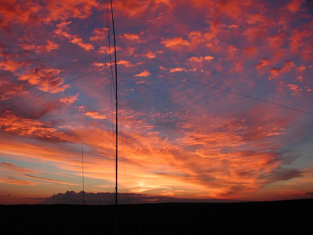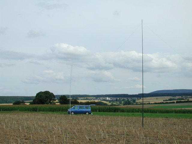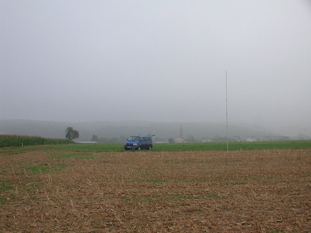 Weil man für Kurzwelle sehr grosse Antennenlängen braucht, frage ich meinen Bruder Harald, ob er nicht einen Bauern nach einem geeigneten Platz fragen könne. Wir dürfen auf eine Anhöhe nördlich von Rayerschied mit 360 Grad Rundumsicht. Der Platz ist optimal. Richtung Norden ist bis zum Horizont alles frei und nur leicht ansteigend. An diesem Wochenende findet ein Wettbewerb in Nordamerika statt und wir wollen einen 47m langen Draht Richtung Norden spannen. Das sollte eigentlich eine Vorzugsrichtung nach Norden ergeben - so die Theorie. Christofer und ich haben jeweils einen 8m hohen, portablen Antennenmast dabei. Das ermöglicht uns vom VW-Bus aus direkt auf 8m Höhe einen Draht zu spannen und von diesem ausgehend die restlichen Meter zum zweiten Mast zu führen. Zusätzlich können wir an Christofs Alu-Mast noch einen Dipol für das 40m-Amateurfunkband befestigen, dieser soll uns Funkamateure aus Ost-West-Richtung bescheren. Das ist zwar nicht gerade die beste Antennenanlage, aber für Portabelbetrieb nicht schlecht.