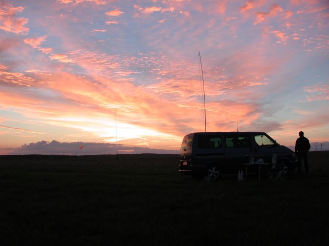 Gegen 23 Uhr geht uns der Strom aus. Die Batterie kann den hohen Strom für das leistungshungrige Funkgerät nicht mehr liefern. Jetzt müssen wir wieder mit dem kleinen Funkgerät mit 5 Watt funken, dafür reicht es noch. Aber auch hier gelingen uns noch ein paar sehr schöne Kontakte. Um 3 Uhr nachts übermannt uns dann doch die Müdigkeit. Nach 2 Stunden in sitzender Haltung melden unsere Knochen, dass wir wohl besser weiterfunken sollten. Wir kochen uns einen kräftigen Kaffee auf dem Campingkocher und versuchen wieder unser Glück. Kurz vor Mittag, nach 24 Stunden, bauen wir alles wieder ab und fahren müde aber stolz und gut gelaunt nach Hause.