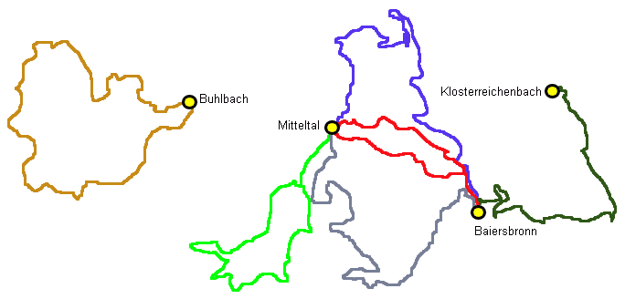 Diesmal machen wir keine Wanderreise von Ort zu Ort, sondern bleiben in Baiersbronn im Hotel und laufen von dort los oder fahren mit dem Bus zum Anfang der Wanderung und laufen zurück. Wir haben uns so entschieden, weil das Wetter zu dieser Jahreszeit unberechenbar sein kann. Am Freitag bevor wir nach Baiersbronn losfahren, sehen wir in den Nachrichten, dass es im Schwarzwald oberhalb 600m schneit - Baiersbronn liegt auf etwa 570m. Der Schnee ist im nachhinein nicht das Problem gewesen - es war wieder einmal der Regen und die Kälte.