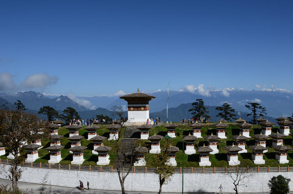 Dann fahren wir zum Dochu-Pass hoch (3068m), wo wir eine absolut grandiose Aussicht haben. Rundherum nur schneebedeckte Berge, selbst Matthias sagt so einen klaren Himmel hatte er hier noch nie. Wir sind im Fotografier- und Guckrausch!