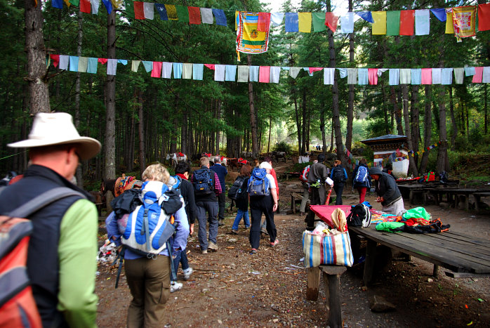 Um kurz vor 8:00 laufen wir los bei 2557m, der Weg ist zwar sehr bequem zu gehen, aber es geht halt den Berg hoch. Nach etwa 50 Minuten und etwa 300 Höhenmetern gibt es in einer Cafeteria erstmal einen Tee. Wir sind schon patschnass geschwitzt, auch wenn jeder in seinem eigenen Tempo geht ist es doch ziemlich anstrengend. Das Schöne ist aber, dass sich die Wolken immer mehr verziehen und wir bald einen blank geputzten Himmel und phantastische Sicht haben. Dann geht es noch weitere 200 Meter nach oben, bis zu dem Punkt an dem man fast genau gegenüber vom Tigernest steht (3063m). 80 Meter über Treppenstufen nach unten, durch die Schlucht und dann wieder 50 Meter über Treppe nach oben und wir haben es geschafft.