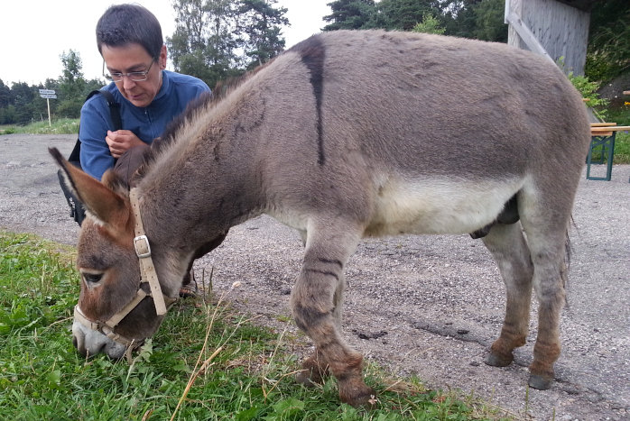 Abendessen gibt es heute in der Ferme Auberge du Ried, wie immer gut! Bibalakas und mit Munsterkäse gratinierte Kartoffeln. Und einer der Esel des Hauses trägt zu unserer Unterhaltung bei.