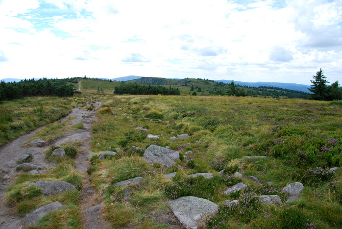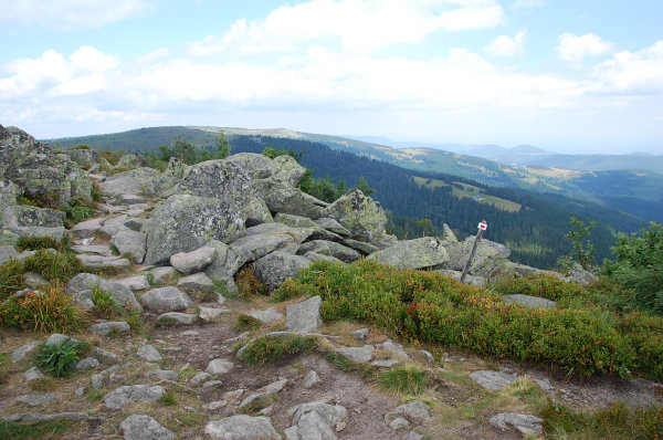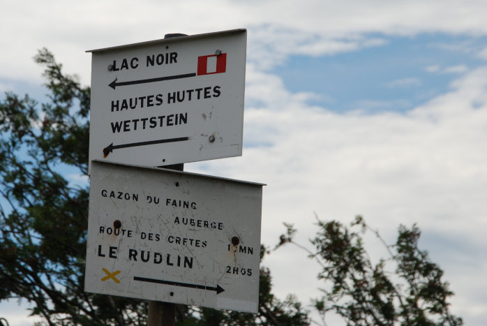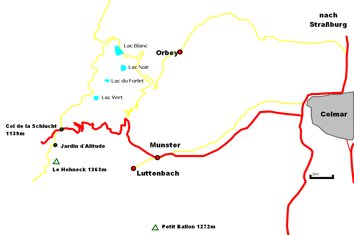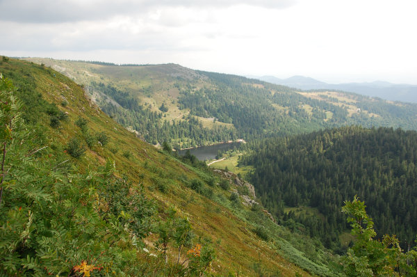 Unsere nächste Wanderung am Sonntag ist zwar angeblich nur 10km lang, aber mit 5 Std. avisiert, die wir auch fast brauchen werden. Wir beginnen in der Nähe des Lac Blanc, klettern dann den "Sentier difficile" hoch um wieder zum Lac Noir runterzugehen. Dann wieder nach oben auf die Hochweiden, wo wir über endlose Blaubeermatten zurücklaufen mit weiter Sicht nach West und Ost.Zur Belohnung gönnen wir uns eine Abfahrt mit der Sommerrodelbahn auf dem von Menschen vollen Col de la Schlucht.