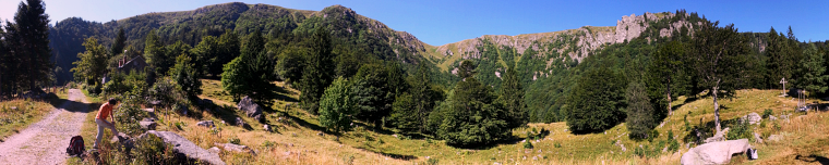 Samstag den 17.8. fahren wir los bei wunderbarem Wetter. Über die Autobahn und Schnellstrasse sind wir in zwei Stunden auf der Höhe von Straßburg. Nördlich von Colmar biegen wir nach Westen auf die Landstrasse ab um ein bißchen die Natur geniessen zu können. Ankunft in Luttenbach schon um 13:00 Uhr, kurz danach ist unser Zelt aufgebaut (wir können`s noch!) und weil das Wetter toll ist beschliessen wir "mal kurz" auf den Petit Ballon zu wandern. Die letzten Wanderungen dort hoch haben wir nur mit viel Nebel oder Regen in Erinnerung.Es wird nur eine knappe 2-Std.-Wanderung, die bei einer Tarte aux Myrtilles in der Ferme Auberge Kahlenwasen endet. Aber was für eine Aussicht vom Petit Ballon (1272m)! Der Himmel ist blau, ein paar weiße Wölkchen, es ist warm, was will man mehr.