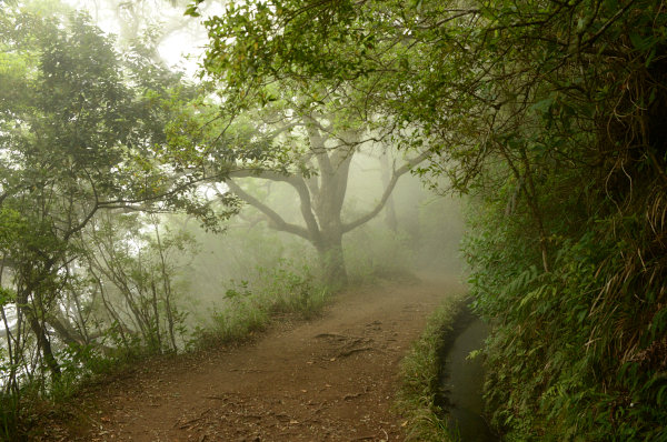 Im Moment kommt natürlich noch niemand entgegen. Wie wird das erst auf dem Rückweg? Die Strecke ist aber total schön. Nur das Wetter könnte etwas besser sein. Es ist nur 15 Grad und sehr neblig. Auf dem Hinweg kommt manchmal etwas Sonne durch. Bei dieser Wanderung müssen wir durch 4 Tunnel. Durch den Längsten laufen wir wohl 3 Minuten und er ist rutschig, rabenschwarz und an manchen Stellen nur 1,4m hoch. Ohne anständige Taschenlampe geht da nix. Macht aber schon Spass.