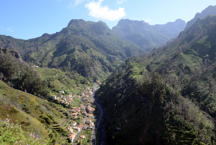 Schon wieder ist der Morgen wie gemalt, einfach unglaublich.Wir fahren nach Prazeres um an einer Levada zu wandern. Leider hat diese Wanderung keinerlei schöne Ausblicke. Da hat man mal das passende Wetter und läuft dann in dichtem Wald herum. Es ist zwar sehr schön aber wir beschliessen, dass 3 Stunden wandern genug sind und wollen lieber noch etwas Prazeres anschauen und dann auf die Hochebene fahren. Prazeres soll angeblich nicht so schön sein; stimmt aber nicht. Im Cafe trinken wir für 2 Euro 2 Galo, schauen uns die Kirche an und schlendern durch den kleinen Zoo. Das Dorf hat 3 Restaurants und wäre als Standort gut geeignet. Weil das Wetter gegen halb 3 immer noch super ist fahren wir bergauf. Wow was eine Sicht. Jede Parkmöglichkeit ist ausgenutzt.