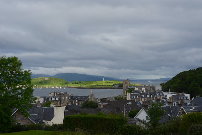 Die ganze Prozedur rückwärts. Bei der Fährüberfahrt zurück sind nur noch sehr Wenige auf dem Oberdeck. Der Himmel ist sehr bewölkt und die Sicht auch nicht so dolle. Aber trotzdem schön. Gegen 6 sind wir in Oban zurück und gehen Fish&Chips essen. Danach kaufen wir uns eine Flasche chilenischen Merlot, den wir im Zimmer mit Blick auf Oban und das Meer geniessen.