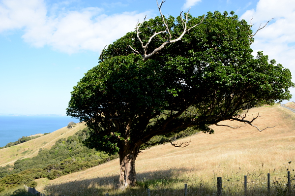 Die Nacht war nicht ganz so stürmisch wie der gestrige Abend. Morgens gibt es zunächst kaum Wolken, dafür ist es aber ganz schön frisch. Wir fahren die Westküste von Coromandel hinunter, machen aber noch einen Abstecher auf eine (natürlich nicht erlaubte) Gravelroad zum Waiau Wasserfall. Hier haben wir vor 20 Jahren schon ein Selbstauslöserbild von uns beiden gemacht und das wiederholen wir jetzt und schicken es per Postkartenapp an Elkes Mutter. Bei der hängt das 20 Jahre alte Bild in der Küche. Sie fragt sich heute noch warum die Postkarte eine deutsche Briefmarke trägt.Dann geht es die sehr schöne Küstenstraße entlang. Zuerst etwas landeinwärts mit schönen Ausblicken auf die grüne Hügellandschaft (mittlerweile ist es hier wieder etwas grüner dank des Regens den wir im Zentrum hatten) und dann das enge Sträßchen direkt am Wasser unter Bäumen entlang. Das Wasser hat eine eigentümliche Farbe irgendwo zwischen ocker und hellgrün. Es ist auch wieder bewölkt und der Wind ist kalt. Es ist wirklich schwierig sich hier auf Wetter einzustellen. In Thames beim Café trinken lesen wir in der Tageszeitung, dass gaaaanz NZ unter einem stabilen Hoch liegt. Bis auf einen kleinen Teil hoch im Norden, also da wo wir gerade sind bzw. hinfahren wollen.
