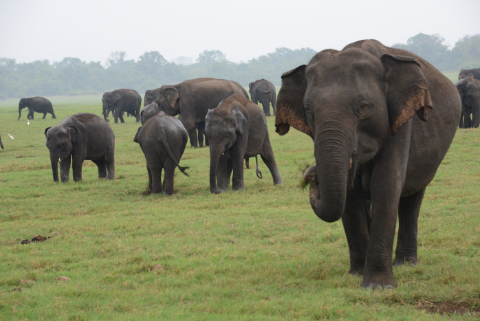 Wie schon erwähnt wird heute alles aufgefahren was geht. Wir fahren in den Kaudulla-Nationalpark. Dort soll es quasi Unmengen von Elefanten geben. Nachdem Sumis GoogleWetterapp heute schon vorhergesagt hat, es solle regnen, hoffen wir auf gutes Wetter. Leider fängt es gerade an als wir uns in die Jeeps setzen. Mist. Der Regen an sich ist gar nicht das Problem, eher der Wind dazu. Nach jedem Bild ist Linseputzen angesagt. Ausserdem wird es langsam dunkel - 1600 ASA brauchts schon. Nichtsdestotrotz sehen wir einen Waran, Schakale, 2 Seeadler, viele Störche, eine Schildkröte mit tollem Muster, Kibitze, Ibisse und einiges andere Kleingetier. Der Regen wird heftiger - der Wind auch. Die 2 Jeeps sind für sonniges Wetter konzipiert, haben aber auch Rollos an den Seiten falls es mal regnet. Auf einer großen Freifläche finden wir bestimmt 200 Elefanten. Die sind hier zwar kleiner als in Afrika, aber genauso schön anzusehen. Es sind sogar viele kleine Elefanten dabei, die immer schützend in die Mitte genommen werden. Einer soll gerade mal 2-3 Wochen alt sein. Echt klasse und man kommt sehr nahe an sie heran. Offensichtlich sind wir etwas zu nahe, denn ein Bulle kommt laut trompetend auf uns zu. Auch wenn es mittlerweile recht dunkel ist und wir, trotz geschlossener Seitenverkleidung, nass sind, macht es unheimlichen Spass.