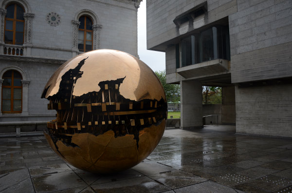 Bild: Im Trinity College Es nieselt ein wenig. Heute wollen wir uns den berühmten "Long Room" im Trinity College ansehen. Weil es Sonntag ist kommt man da erst um 12 rein. Wir stiefeln aber schon mal um 10 durchs College und da stellen sich doch tatsächlich schon Leute an. Hmmm? Wir machen das nicht und laufen zum Merrion Square. Drumherum sollen die ältesten Häuser Dublins sein und an einer Ecke des Parks ist ein Denkmal von Oscar Wilde.