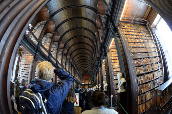 Kurz vor 4 gehen wir los. Trinity College liegt um die Ecke und macht halb 5 zu. Es regnet immer noch und die Schlange am Eingang ist nur noch 1/4 so lang. Wir stellen uns an. Es geht zügig voran, aber die Zeit läuft. Um 16:15 winkt uns der Einlasskontrolleur durch – ohne Bezahlung. Tata. 22€ gespart. Dafür müssen wir uns natürlich beeilen. Die heute aufgeschlagene Seite des "Book of Kells" müssen wir auch rechts liegen lassen, weil dies zu lange dauern würde bis man an der Vitrine ist. Also rauf in den "Long Room". Der Bibliothekssaal ist sehr beeindruckend, riesige Bücherregale über 2 sehr hohe Stockwerke. Toll!