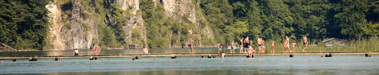 Dann geht es bergab zum Frauensee. Der liegt einsam im Wald und traumhaft schön. Immer weiter geht es runter bis nach Pflach auf Lechebene. Dort füllen wir Wasser auf, denn ein Liter fehlt schon. Heute gibt es sonst keine Einkehrmöglichkeit und keinen Trinkwasserbrunnen mehr bis Füssen, so dass wir haushalten müssen bei 32°C. Jetzt kommt ein nicht so schöner Teil an der Autobahn entlang und dann ewig bergauf. Leider ist dieser steile Teil auf Schotterwegen. Irgendwann beim Aufstieg überschreiten wir auch die österreichisch-deutsche Grenze ohne es zu merken. Die Landschaft ist zwar schön, aber mit dem Geniessen haperts etwas. Auf der Höhe angelangt wird der Untergrund besser, aber nicht einfacher. Steil bergab, viele Wurzeln und glitschige Erde. Nun gibt es viele Buchen und weniger Nadelhölzer. Lange geht es durch den Wald bis wir Schloß Hohenschwangau und Schloß Neuschwanstein am Alpsee sehen. Die Schlößer - naja, aber der See ist toll. Türkise Farbe und glasklar. Klasse. Einige Leute schwimmen im See und wir beneiden sie darum. Kein Vergleich zu unseren überlaufenen Baggerseen zuhause.