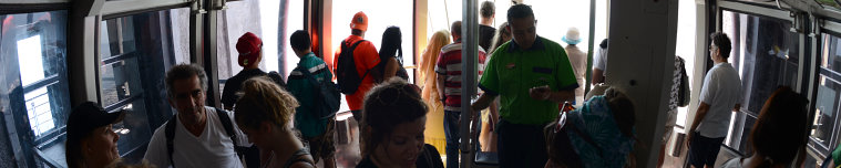 Wir stehen insgesamt 90 Minuten an! Innerhalb dieser Zeit lernt man alle möglichen Leute um sich rum kennen. So kann Wartezeit auch mal Spaß machen :-). Die Seilbahnfahrt dauert dann sage und schreibe 4 Minuten und eine 360°-Drehung. Viel zu kurz! Oben angekommen gibt es verschieden lange Wege. Wir laufen einfach mal los; so richtig verlaufen kann man sich hier nicht. Immer wieder gibt es tolle Ausblicke in alle Himmelsrichtungen. Es ist zwar etwas diesig, aber wir wollen mal nicht meckern. Es ist hier oben warm und nur etwas windig – sehr angenehm.