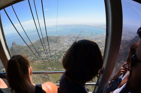 Wir haben 2 riesige Weisshalsraben und 2 Rockdassies gesichtet. Immerhin. Nach 2 Stunden gönnen wir uns einen Latte im Tablemountaincafe. Danach fahren wir wieder runter. Es wird langsam voll hier oben. Komischerweise gibt es keinerlei Schlange bei der Bergabfahrt.