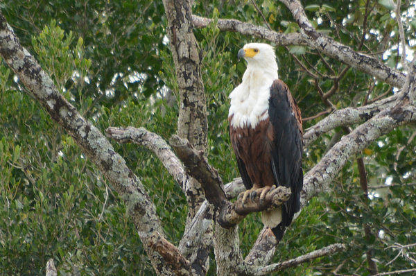 Etwas weiter sehen wir noch 2 Fischadler. Wir kommen recht nah dran und können diese großen Vögel gut bestaunen. Zwei Giant Kingfisher posieren auch noch für uns, während die Krokodile eher uninteressiert wirken. Am Ufer steht viel Schilf in dem Webervögel ihre Nester bauen. Der männliche Vogel braucht etwa 5 Tage für den Bau. Dann lockt er ein Weibchen an um sie von der Behausung zu überzeugen. Die schaut sich alles genau an. Gefällt es ihr nicht zerrupft sie das Nest und das Männchen versucht es wieder solange bis es klappt!