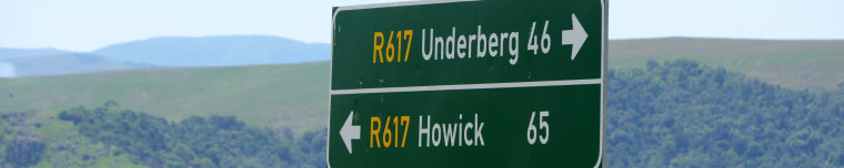 Wir fahren von der N2 ab und nehmen die R617 nach Westen. Die Landschaft wird immer bergiger – und schöner. Es ist unglaublich. Heute morgen noch am indischen Ozean und jetzt, 2 Stunden später, auf 1500m in den Bergen. Erst dominieren noch Baumanpflanz-ungen das Landschaftsbild, dann wird es ländlicher mit sehr viel Vieh und Weideflächen. Ab und an tauchen Ortschaften an der Strasse auf mit kleinen Häuschen. Wir können schon die Drakensberge erkennen.