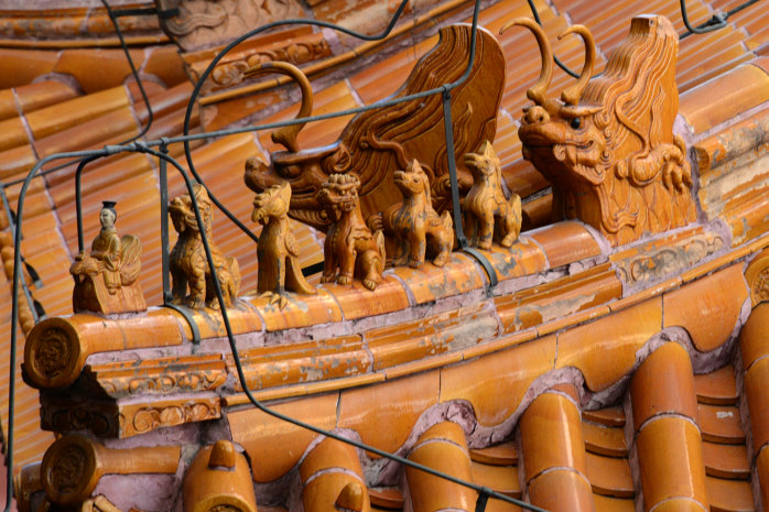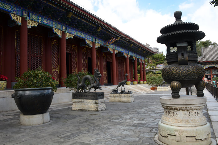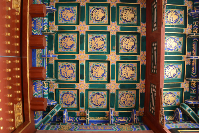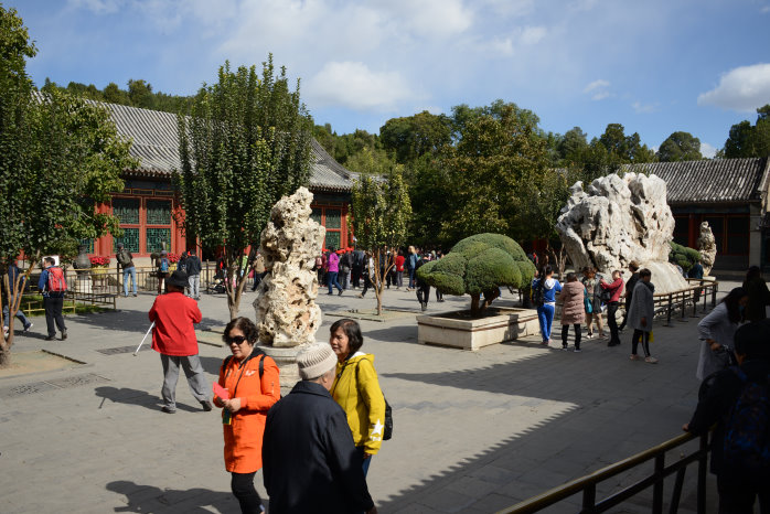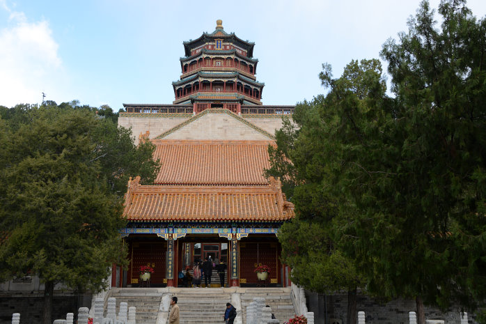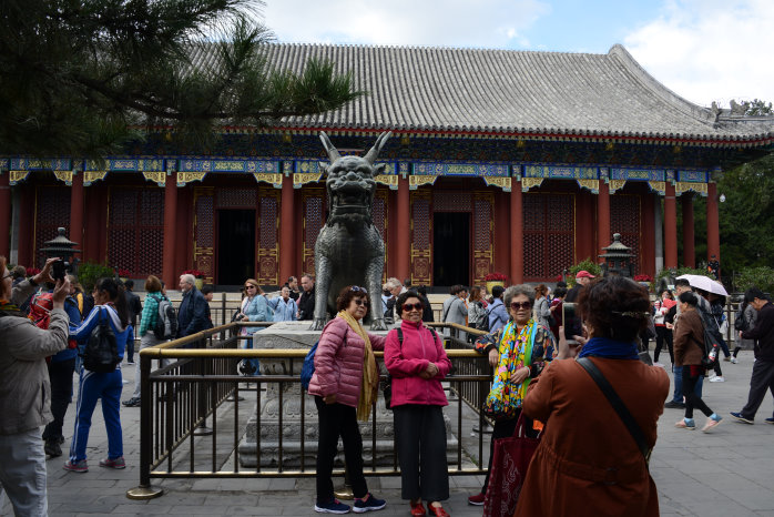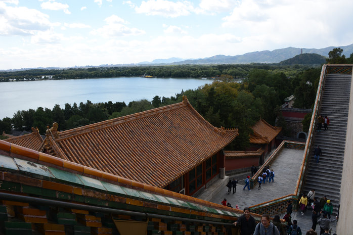 Es ist relativ früh und kalt und so ist noch wenig los. Kun erzählt uns die Geschichte des Palastes und lässt uns dann alleine die riesige Anlage ansehen. Wir laufen durch die verschiedenen Höfe mit den prunkvoll eingerichteten Gebäuden aus Holz. Ein etwa 700m langer überdachter Weg führt am Kunming-See entlang. Auf der Hälfte dieses Weges geht es zu einem buddhistischen Tempel ab. Wir leisten uns für 10 Yuan pro Person den Aufstieg, denn der Tempel liegt auf einem aufgeschütteten Hügel. Beim "Aufstieg" nieselt es doch tatsächlich ein wenig. Aber oben angekommen scheint schon wieder die Sonne und wir haben einen herrlichen Blick auf Peking. Im Tempel selbst ist eine vielarmige Gottheit. Passt so gar nicht zum Buddhismus!? Die Gebäude sind aber trotzdem toll.