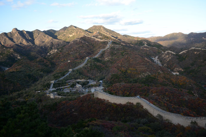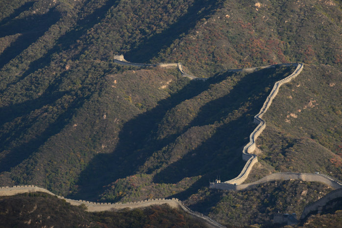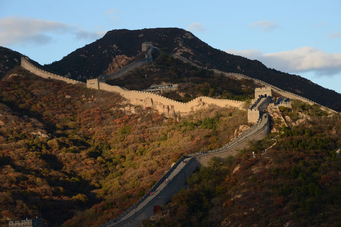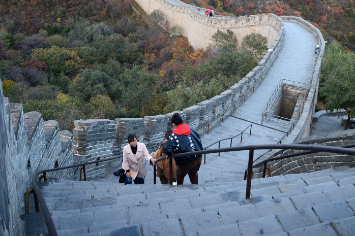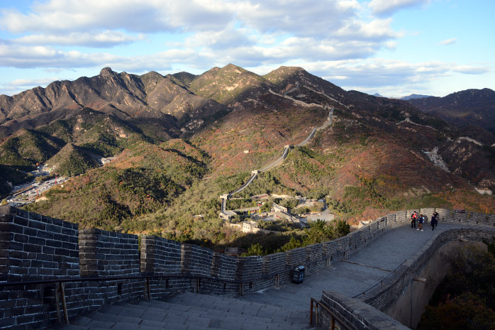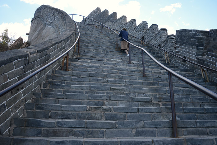 Danach fahren wir nochmals eine halbe Stunde zur Großen Mauer. Vor Ort gibt es zwei Varianten die Mauer zu erkunden. Eine nach Norden und eine nach Süden. Beide Varianten sind etwa gleich lang und steil. Wir entscheiden uns für die etwas kürzere und steilere Südseite, weil wir dann (hoffentlich) die Sonne auf der anderen Seite haben und schönere Fotos machen können. Alle Anderen der Gruppe laufen die südliche Strecke.