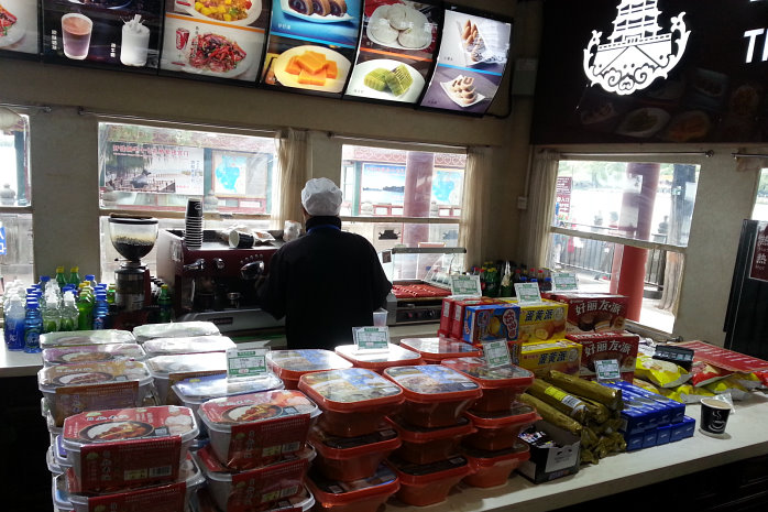 Das Frühstücksbuffett ist Gott sei Dank nicht nur Continental. Was immer das hier bedeutet. Auf der Asiaseite des Buffetts gibt es Teaboiled Eggs, verschiedene Buns (gefüllte Teigtaschen), gedämpfte Süsskartoffel- und Bambusstücke und vieles mehr. Ich gehe an den Suppenstand und lasse mir eine Schüssel mit Nudeln machen. Den Inhalt bestimmt man selbst. Lecker. Dazu gibt es, unpassenderweise, Kaffee. Aber das brauch ich einfach.