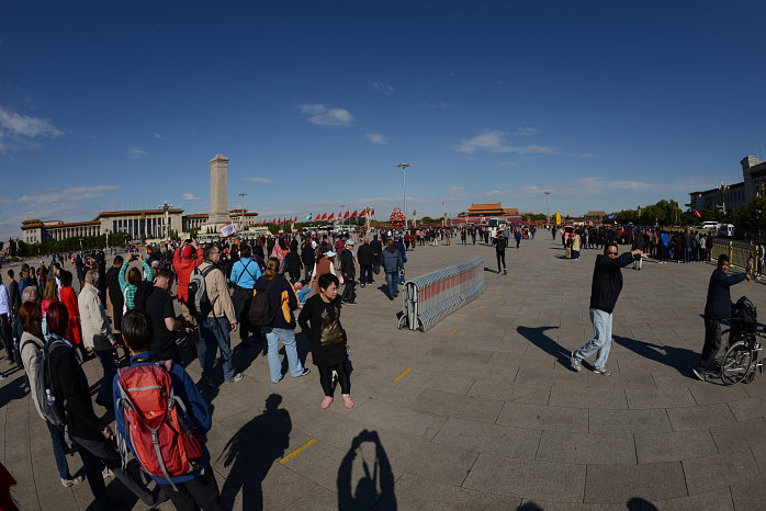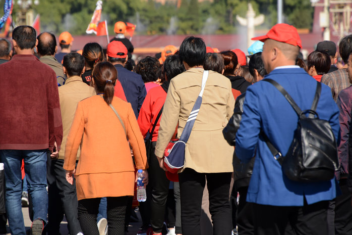 Das Wetter ist wieder super, weniger kalt als gestern, weil der Wind fehlt. Heute stehen zuerst der Tian’anmen-Platz und die Verbotene Stadt an. Es geht um 9 Uhr los und wir fahren eine halbe Stunde. Um diese Zeit ist am Platz des Himmlischen Friedens (Tian’Anmen-Platz) bereits der Bär los. Hier ist auch das Mao-Mausoleum und angeblich stehen einige schon seit 5 Uhr morgens hier um hinein zu kommen. Die Schlange ist jetzt an dem 700m langen Platz bereits sehr lang. Gott sei Dank wollen wir da nicht auch noch rein :-). Interessant wäre es wahrscheinlich schon.