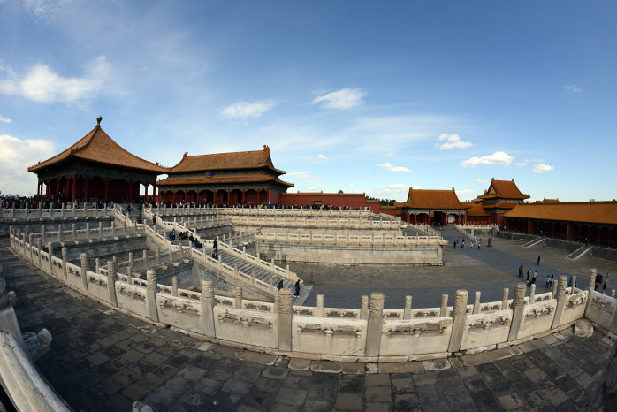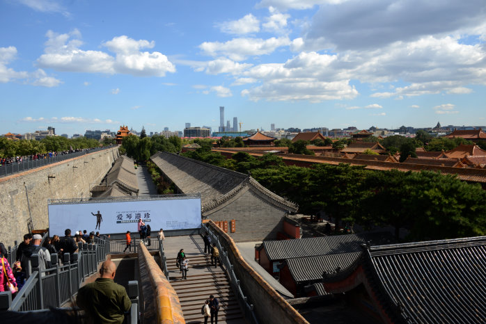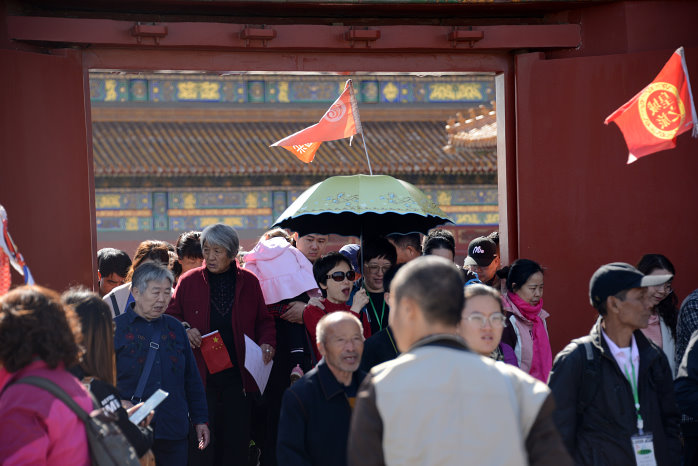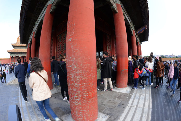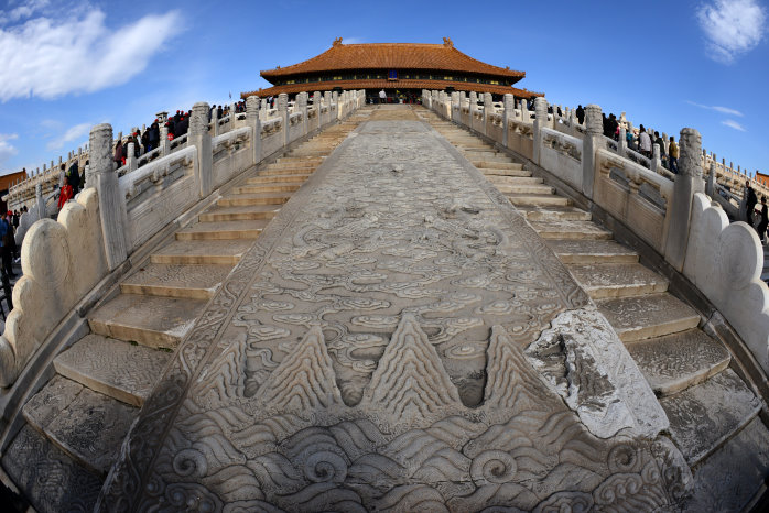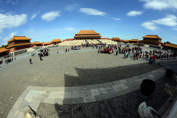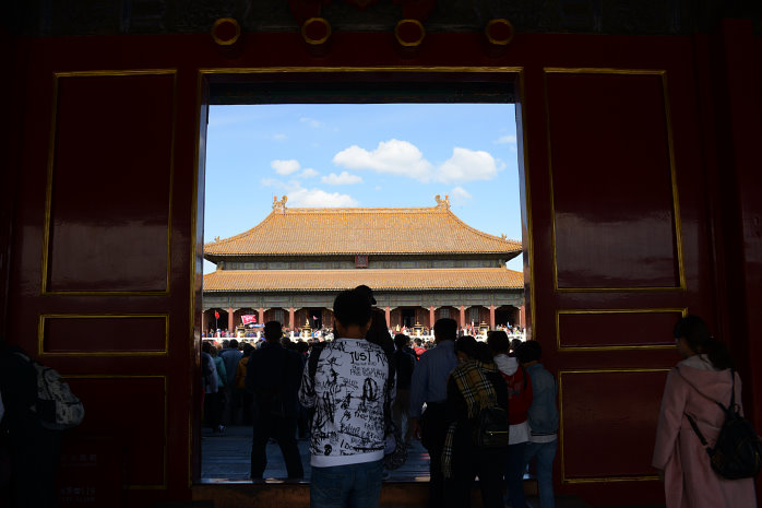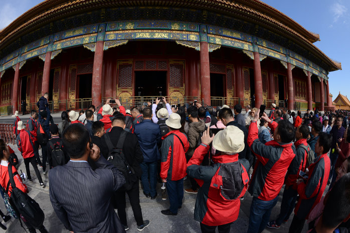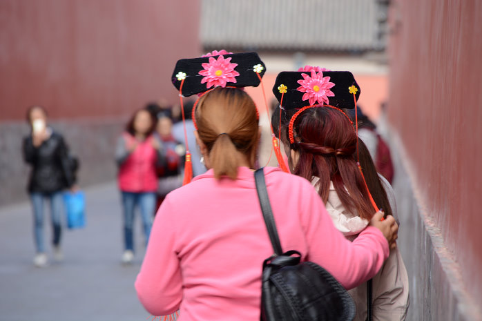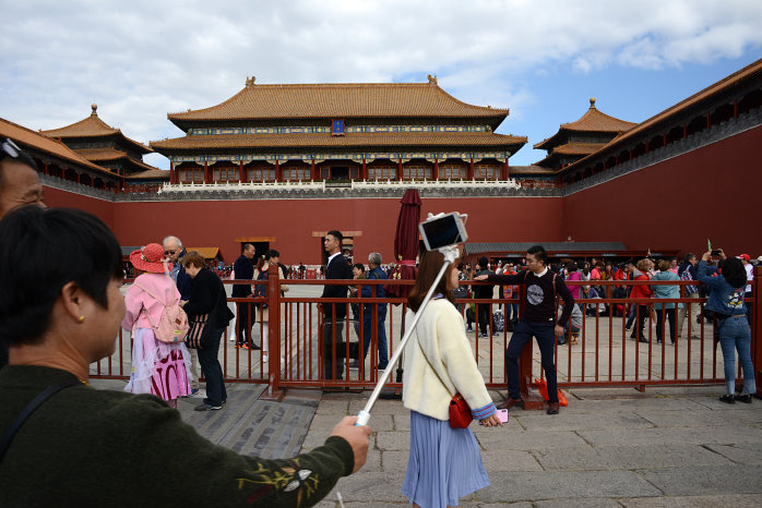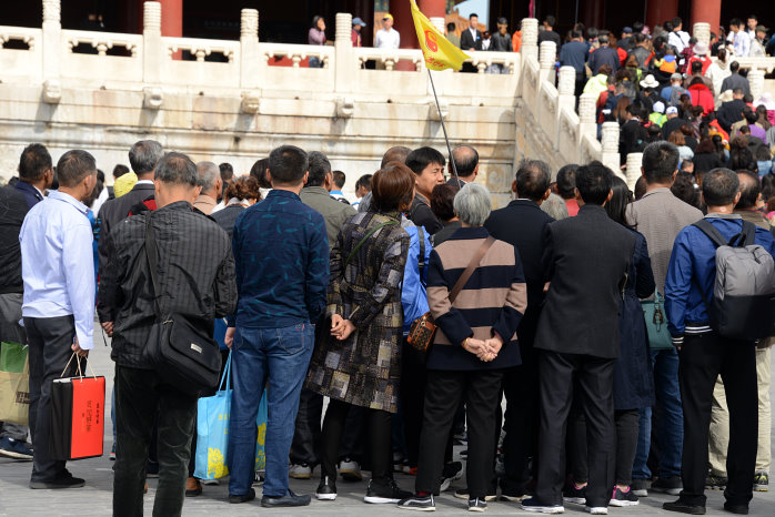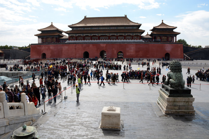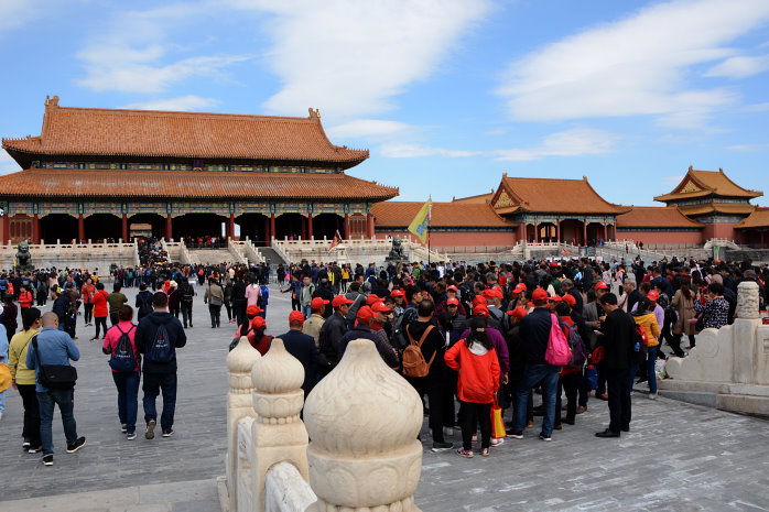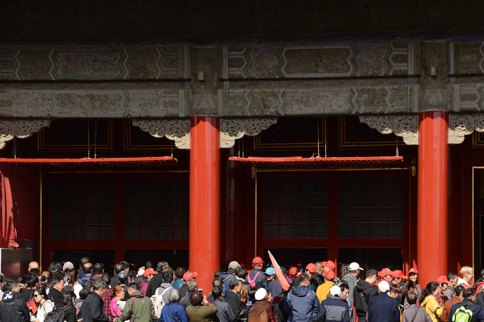 Gefühlt stehen hier alle 1,5 Mrd. Chinesen am Eingang an. Dabei ist die tägliche Besucherzahl auf 80000 begrenzt. Es geht aber doch recht zügig hinein. Hier begreift man den Sinn eines Guides mit einer hochgereckten Fahne. In dem Gewusel muß man sich einfach verlieren. Selbst Elke und ich suchen uns manchmal, so dicht ist die Menschenmenge. Kun entscheidet sich glücklicherweise dafür, dass wir jeder für sich bis zum Nordtor die Anlage besichtigen. Die Gebäude an sich sind schon beeindruckend, aber in Verbindung mit mehreren großen Plätzen, Mauern und Stufen kommt man sich ganz klein vor.