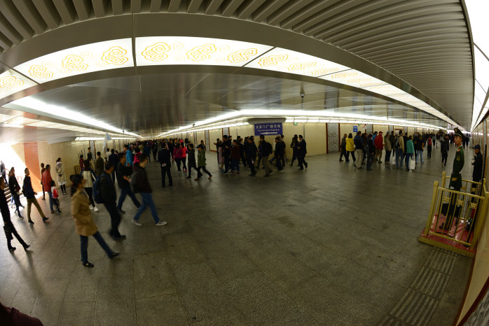 Genügend andere Chinesen und natürlich auch Touris gehen durch einen Fußgängertunnel unter einer vielbefahrenen Straße zum Eingang der Verbotenen Stadt. Toiletten gibt es auf der anderen Straßenseite, aber ein Mann uriniert in einer Ecke in eine Flasche. Hatten wir auch noch nicht.