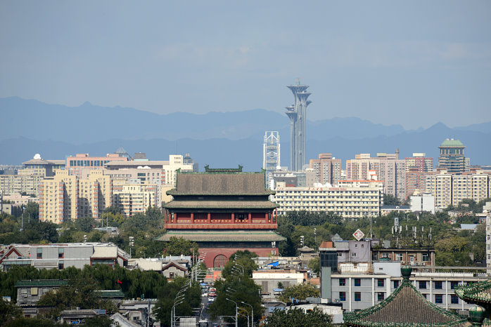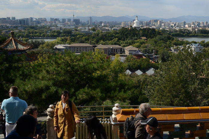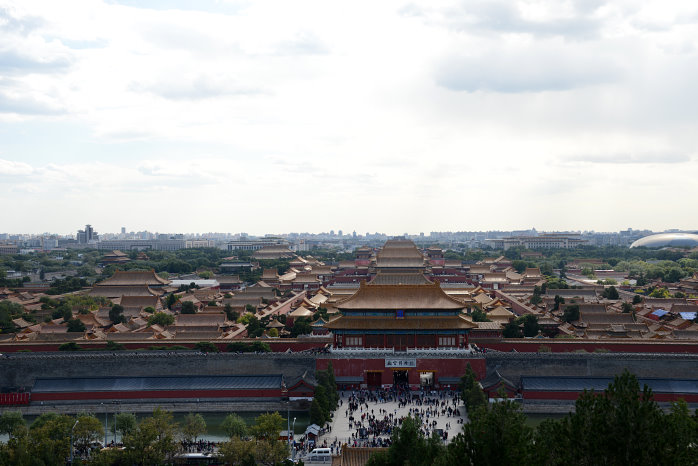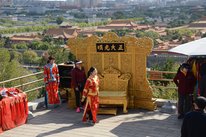 Wir verlassen die Verbotene Stadt auf der Nordseite, überqueren eine Strasse und gehen zur nächsten Sehenswürdigkeit – dem Kohlehügel. Der entstand dadurch, dass man einen Graben um die Verbotene Stadt gegraben und den Aushub aufgeschüttet hat. Oben drauf ist eine Pagode mit einem herrlichen Blick über die Verbotene Stadt und Peking im Hintergrund. Da die Luftverschmutzung offensichtlich nicht die Fernsicht trübt sieht man wirklich gut. Bevor es in den Bus und weiter geht kaufen Elke und ich uns einen Kaffee. Drinnen sitzen Chinesen beim Mittagessen, das aber weniger interessant scheint als wir.