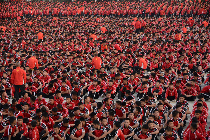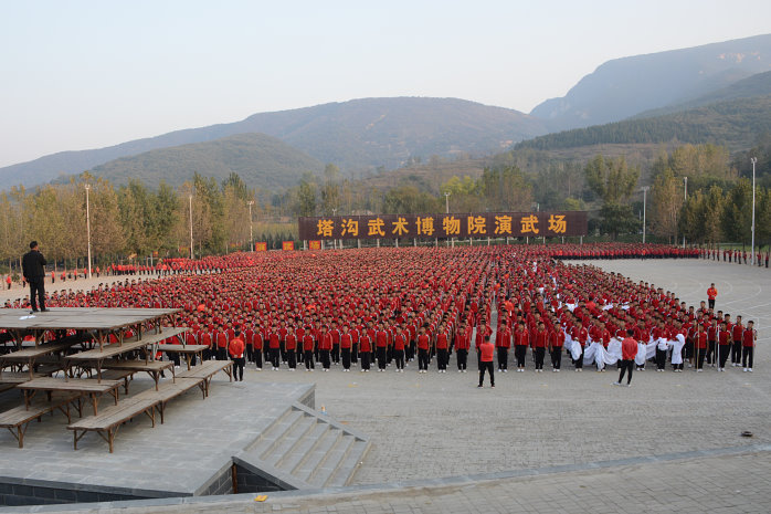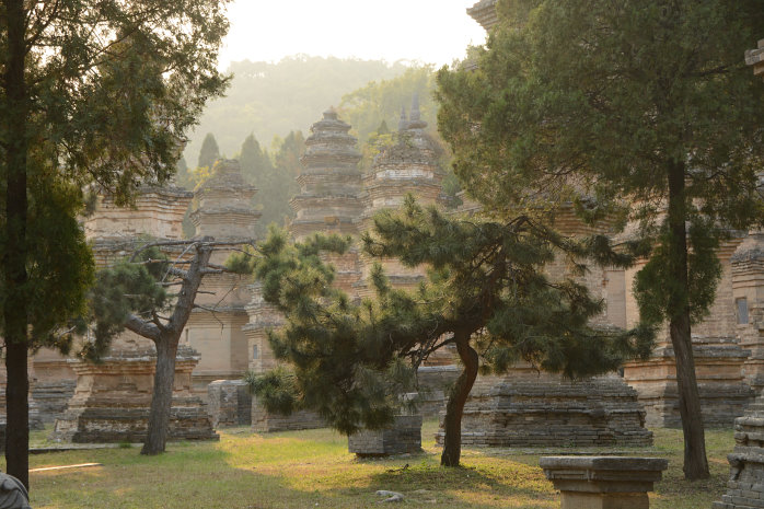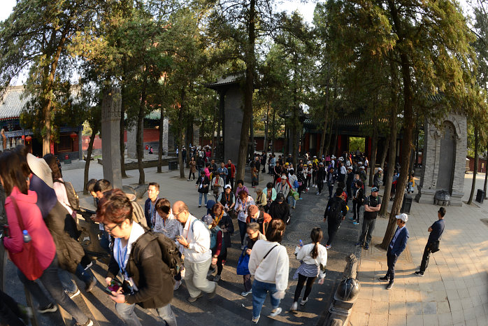 Zum Abschluss schauen wir uns noch den berühmten Pagodenwald an. Dann geht es zurück zum Bus. Auf dem 3km langen Weg dorthin kommen wir an einem "Exerzierplatz" vorbei. Offensichtlich sind gerade alle Schüler der angeschlossenen Kung-Fu-Schule da - und das bedeutet Tausende. Ein Trainer brüllt laute Kommandos in die diszipliniert aufgestellte Menge. Wirkt schon etwas komisch!