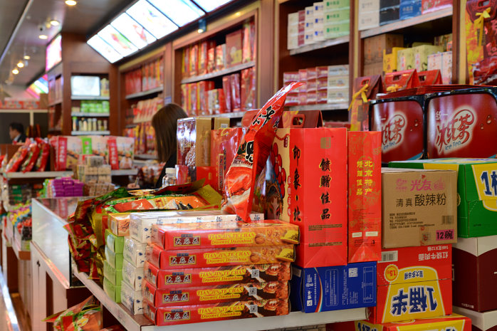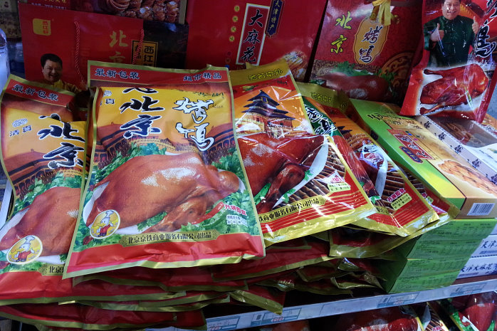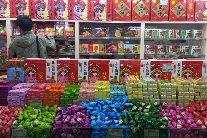 In Luoyang zurück, es ist mittlerweile 19 Uhr, bringen wir nur schnell unser Gepäck in ein sehr spaciges Zimmer das an ein Raumschiff erinnert im 19.Stock und gehen direkt wieder los zum Abendessen. Seit dem Fresspaket, das wir im Laufe des Tages verzehrt haben, haben wir nichts mehr gegessen. Wir haben richtig Hunger. Die Speisen sind diesmal etwas anders zubereitet – schärfer. Auch ein paar neue Sachen gibt es. Lecker. Wir bestellen sogar nach! Später gehen Elke und ich noch zu einem Minimarkt und kaufen etwas zu trinken, Kekse und ein paar Bonbons für morgen.