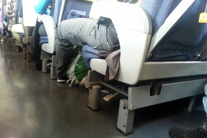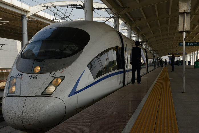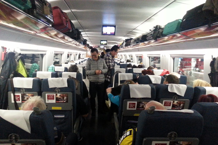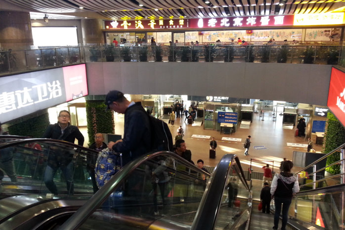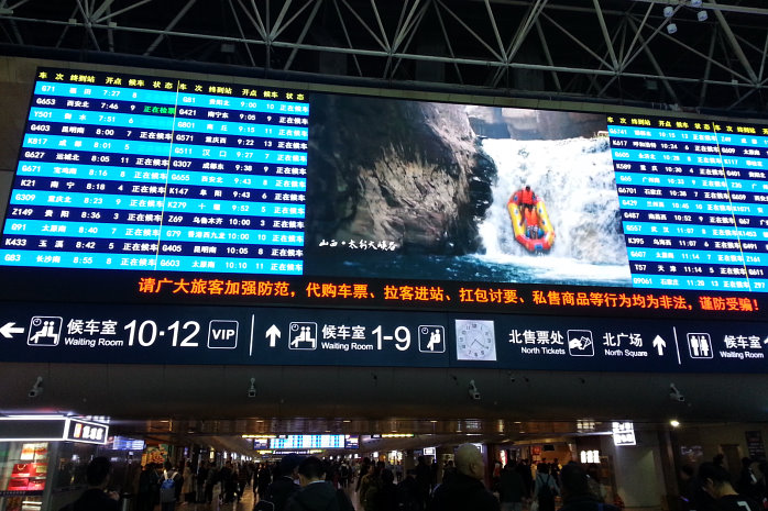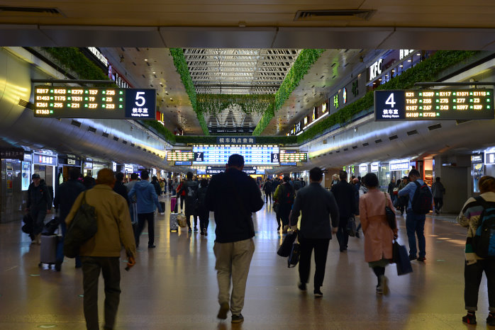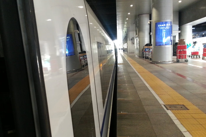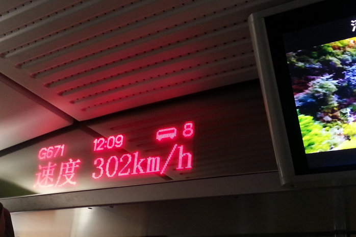 Züge in China sind pünktlich! Das liegt auch daran, dass man genau 2 Minuten für Aus- und Einstieg hat. Das ist bei der Menge Leute, die den Zug benutzen, echt sportlich, aber es klappt. Am Bahnsteig sind genaue Markierungen wo welcher Wagen hält und wo sich die Tür befindet. Auch sind die Sitze in den Abteilen drehbar. Dadurch sitzt man immer in Fahrtrichtung.